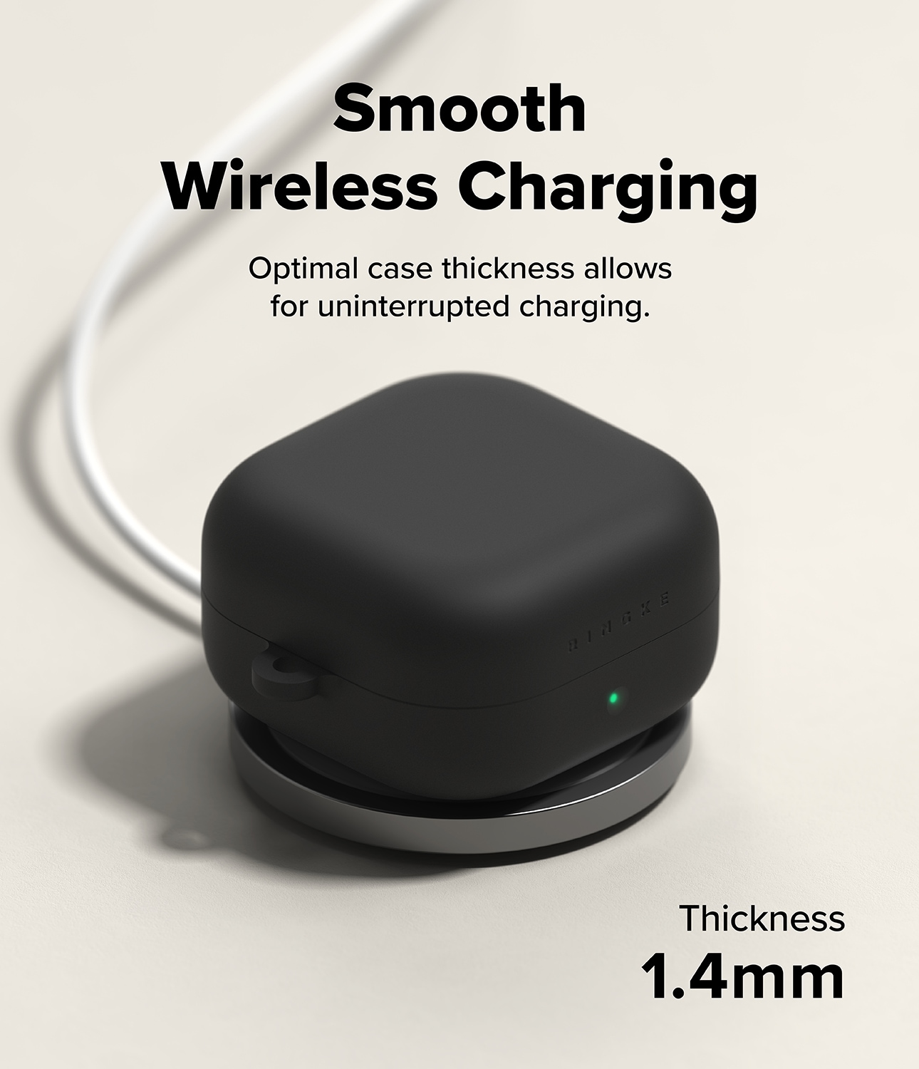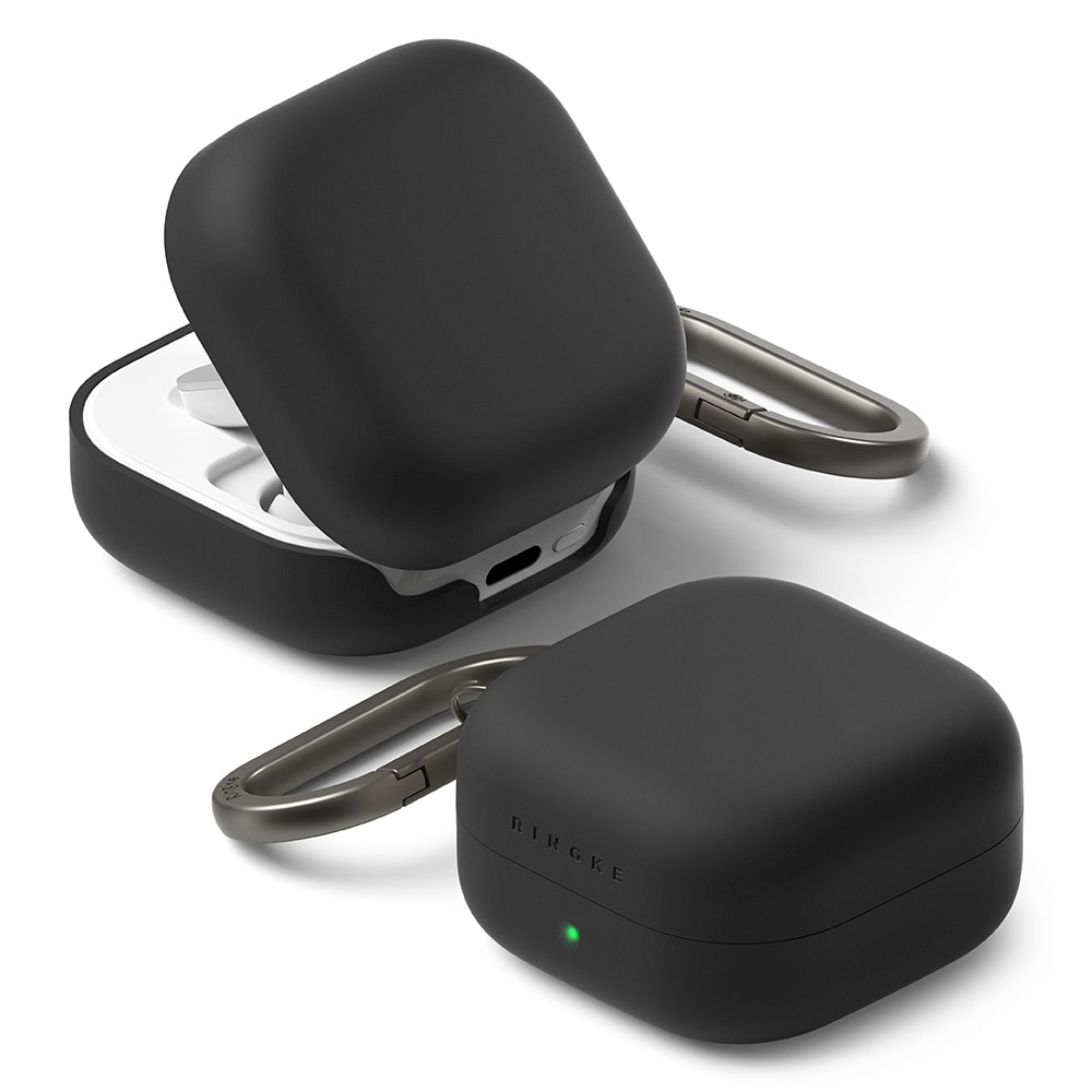 Stilrent silikonecover med karabinhage til Samsung Galaxy Buds 4 fra Ringke. Coveret har et slankt design, men er stadig stødabsorberende for at beskytte mod skader. Det er lavet af silikone i høj kvalitet med en overflade, der både føles luksuriøs og giver god beskyttelse. Coveret har et to-lags design med en stærk polykarbonatramme indvendigt og silikone udvendigt.