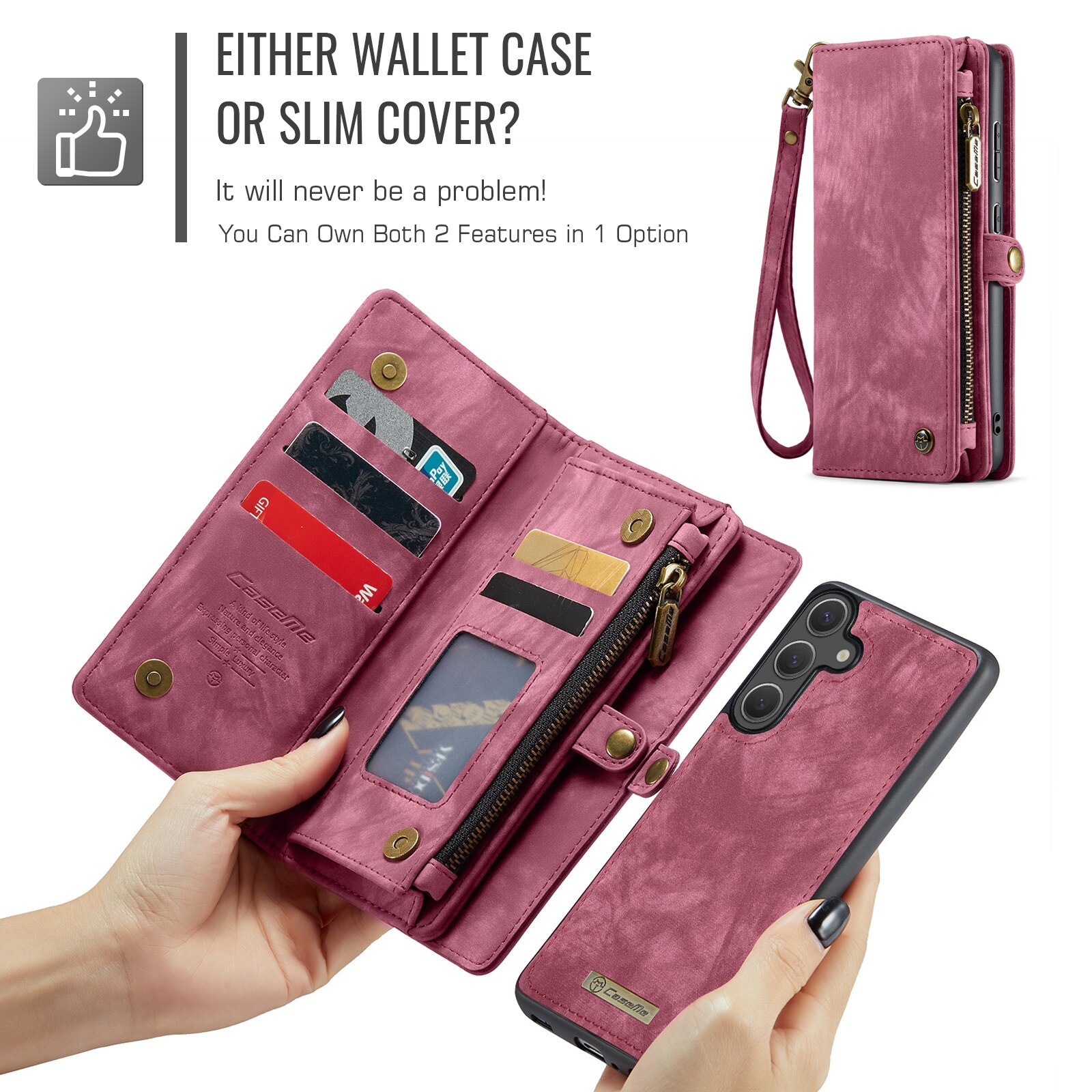 Mobiletui med magnetcover og tegnebog med ekstra mange kortrum fra CaseMe. Denne rummelige tegnebog har en seddellomme, lynlås til mønter og flere kortpladser.