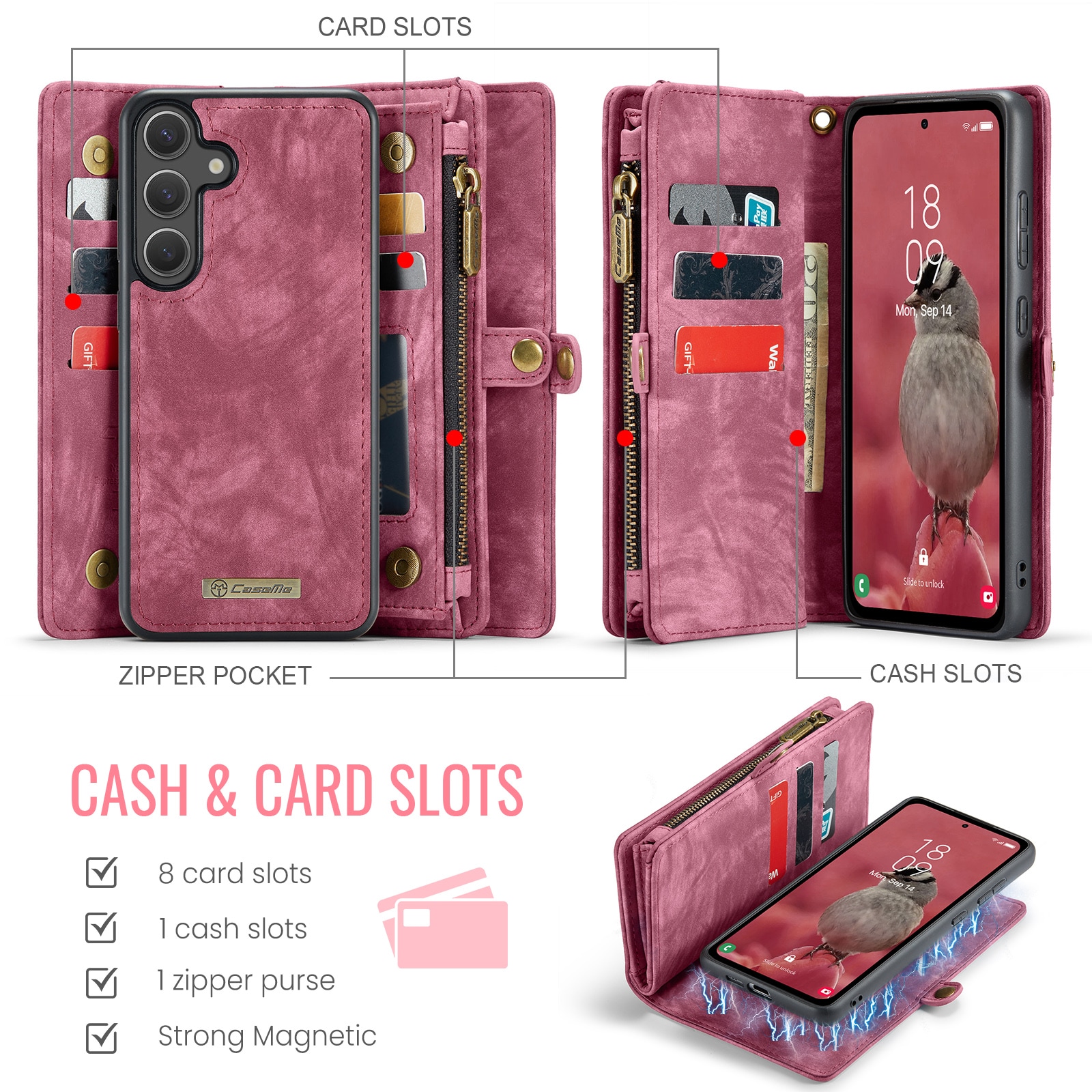 Mobiletui med magnetcover og tegnebog med ekstra mange kortrum fra CaseMe. Denne rummelige tegnebog har en seddellomme, lynlås til mønter og flere kortpladser.