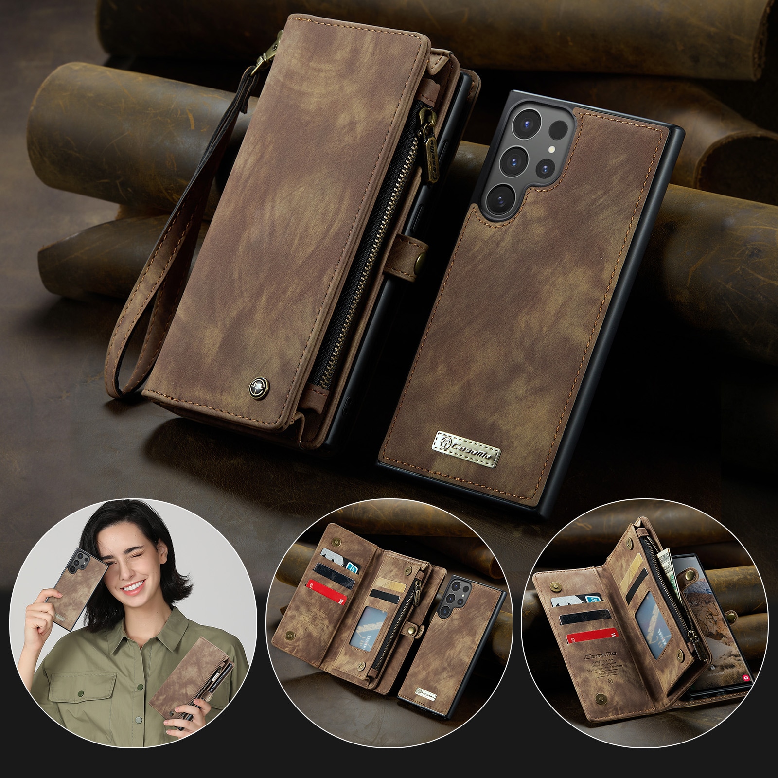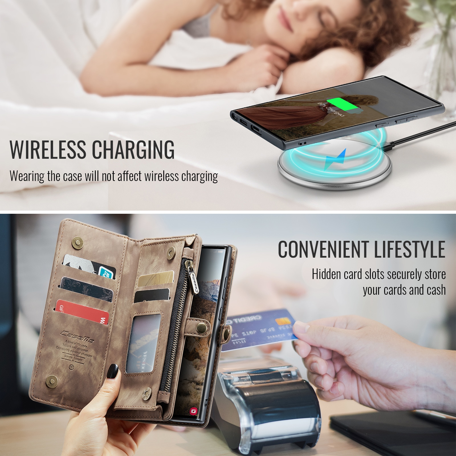 Mobiletui med magnetcover og tegnebog med ekstra mange kortrum fra CaseMe. Denne rummelige tegnebog har en seddellomme, lynlås til mønter og flere kortpladser.