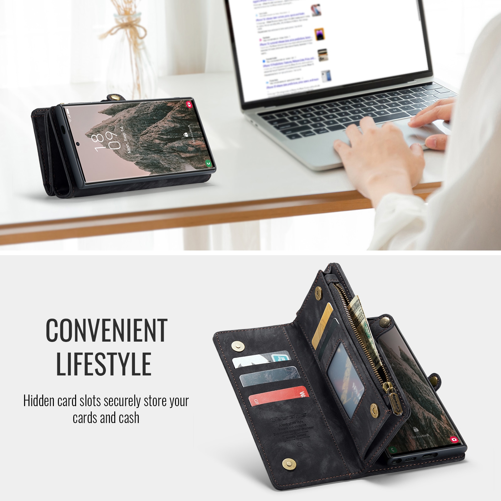 Mobiletui med magnetcover og tegnebog med ekstra mange kortrum fra CaseMe. Denne rummelige tegnebog har en seddellomme, lynlås til mønter og flere kortpladser.