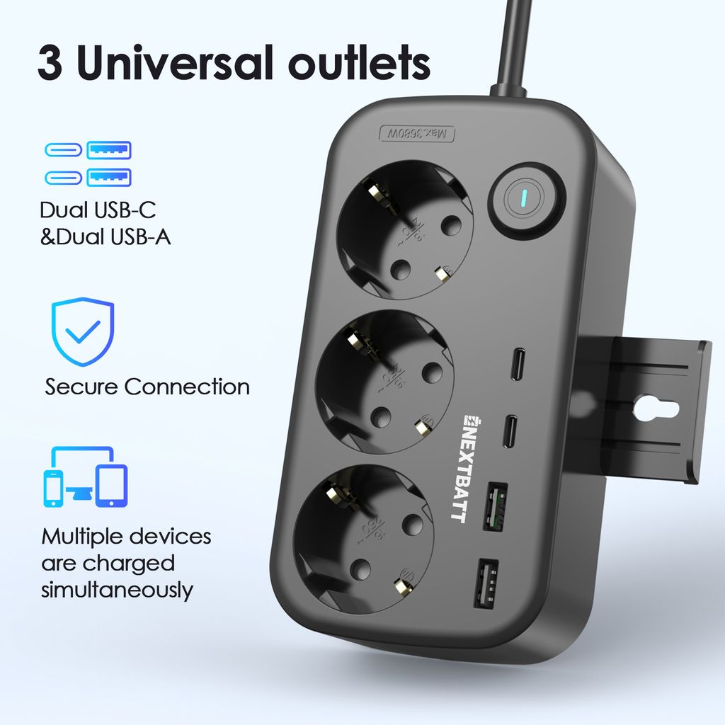 61572Jordet stikdåse med afbryder 3-vejs + 2x USB-C + 2x USB-A 230V, 1.5m, Sorthttps://www.phonelife.dk/opladere-kabler/tilbehor-opladere-kabler/jordet-stikdase-med-afbryder-3-vejs-2x-usb-c-2x-usb-a-230v-1-5m-sort?channelCountry=DKhttps://www.phonelife.dk/pub_images/original/0_-_-_5_-_-_5_mJSufCua-9sIypTIzbv4Z.jpgInStock159DKK/opladere-kabler/tilbehor-opladere-kablerNEXTBATT<p>NEXTBATT stikdåse er en praktisk og kraftfuld løsning til at tilslutte og oplade flere enheder samtidig. Med tre jordede stikkontakter samt to USB-C- og to USB-A-porte kan du nemt oplade mobiltelefon, tablet, laptop, høretelefoner og andre USB-enheder - perfekt til hjemmet, kontoret eller arbejdspladsen.</p>
