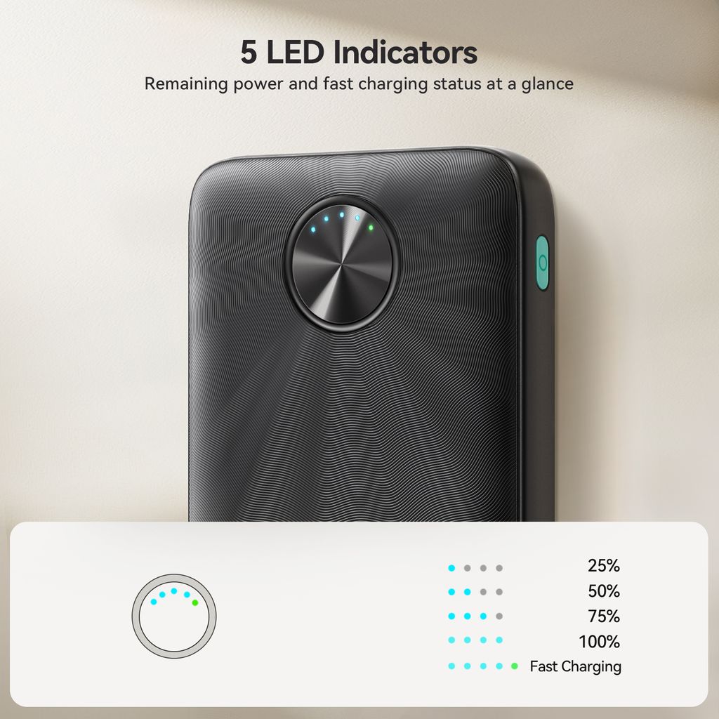 Powerbanken understøtter flere hurtigopladningsprotokoller og er kompatibel med mobiltelefoner, tablets og andre USB-enheder. LED-indikatorerne viser tydeligt batteriniveauet, og indbyggede sikkerhedsfunktioner sikrer tryg brug.
