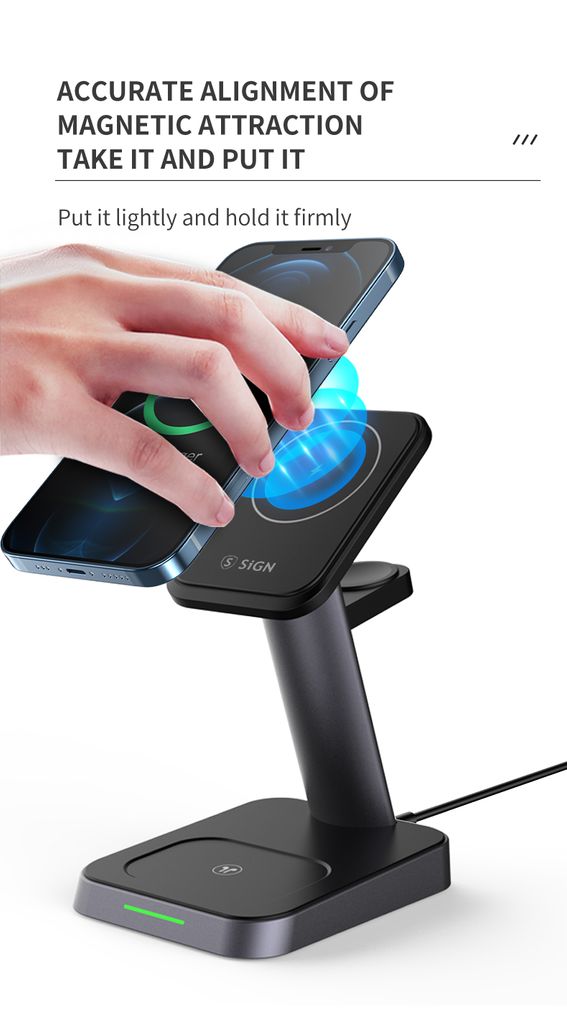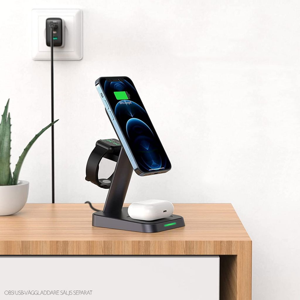 SiGNs 3-i-1 trådløse MagSafe ladestation 15W er en praktisk og pladsbesparende løsning til at oplade din mobiltelefon, Apple Watch og AirPods samtidigt. Det magnetiske MagSafe-kompatible design sikrer stabil og sikker opladning og gør det nemt at placere enheden korrekt.