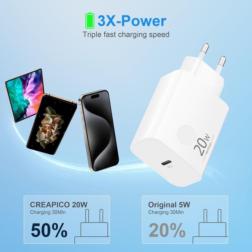 <p>Med en udgangseffekt på op til 20W kan du hurtigoplade kompatible enheder hurtigt og sikkert. Den intelligente opladningsteknologi beskytter mod overopladning, overophedning og overspænding, hvilket sikrer tryg brug. Det kompakte og lette design gør opladeren nem at tage med, perfekt til hjemmet, kontoret eller rejser.</p>