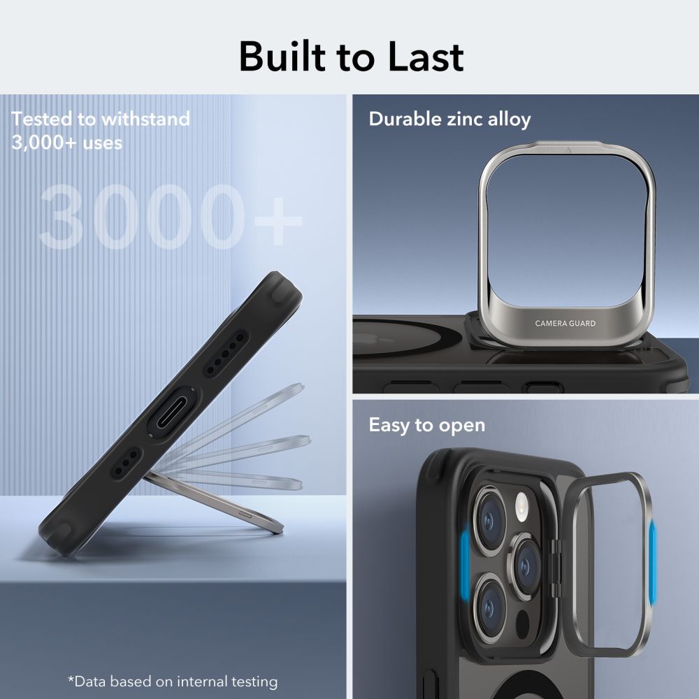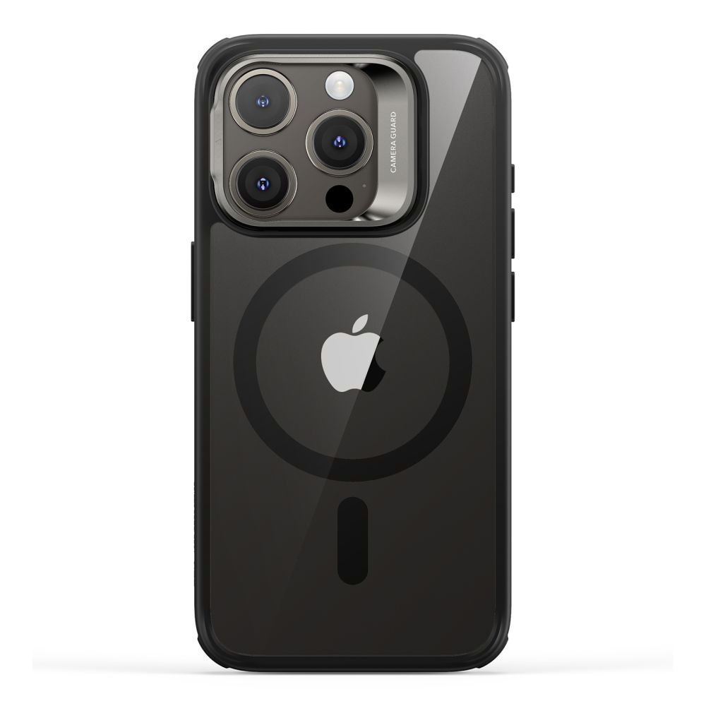 Beskyttende, MagSafe-kompatibelt TPU-cover med indbygget kickstand fra ESR til Apple iPhone 15 Pro. Coveret er gennemsigtigt og lader telefonens design skinne igennem, samtidig med at det beskytter effektivt. Det udklappelige stativ på bagsiden er sølvfarvet. Coveret er MagSafe-kompatibelt takket være den indbyggede magnetiske ring, hvor du nemt kan fastgøre din MagSafe-oplader eller andet kompatibelt tilbehør.