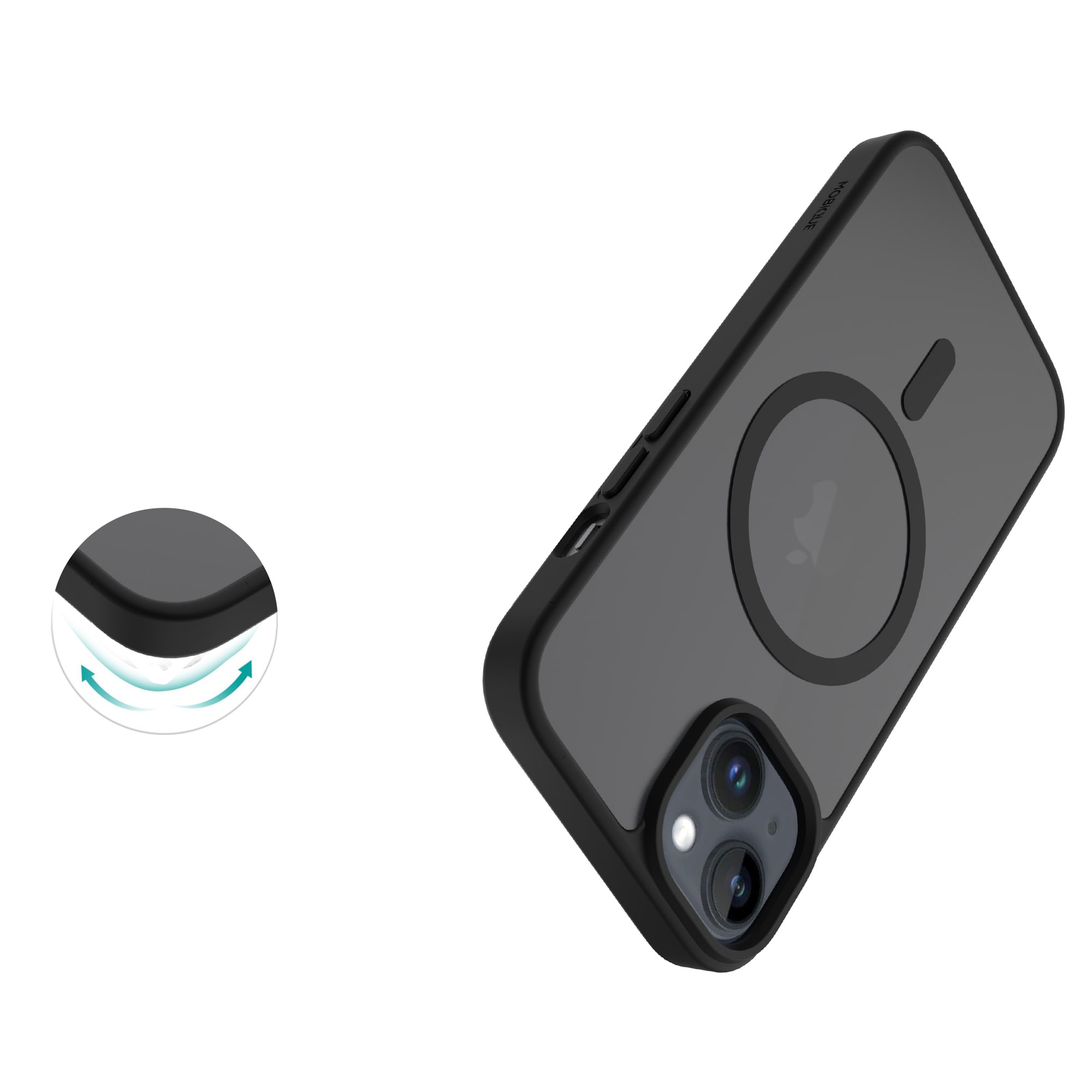 Hybridskal med magnetisk ring til Apple iPhone 15 fra Mobique. Coveret har en stilfuld mat finish og er udstyret med en magnetisk ring på bagsiden. Ringen gør det nemt at bruge coveret sammen med MagSafe-kompatibelt tilbehør som opladere og kortholdere.