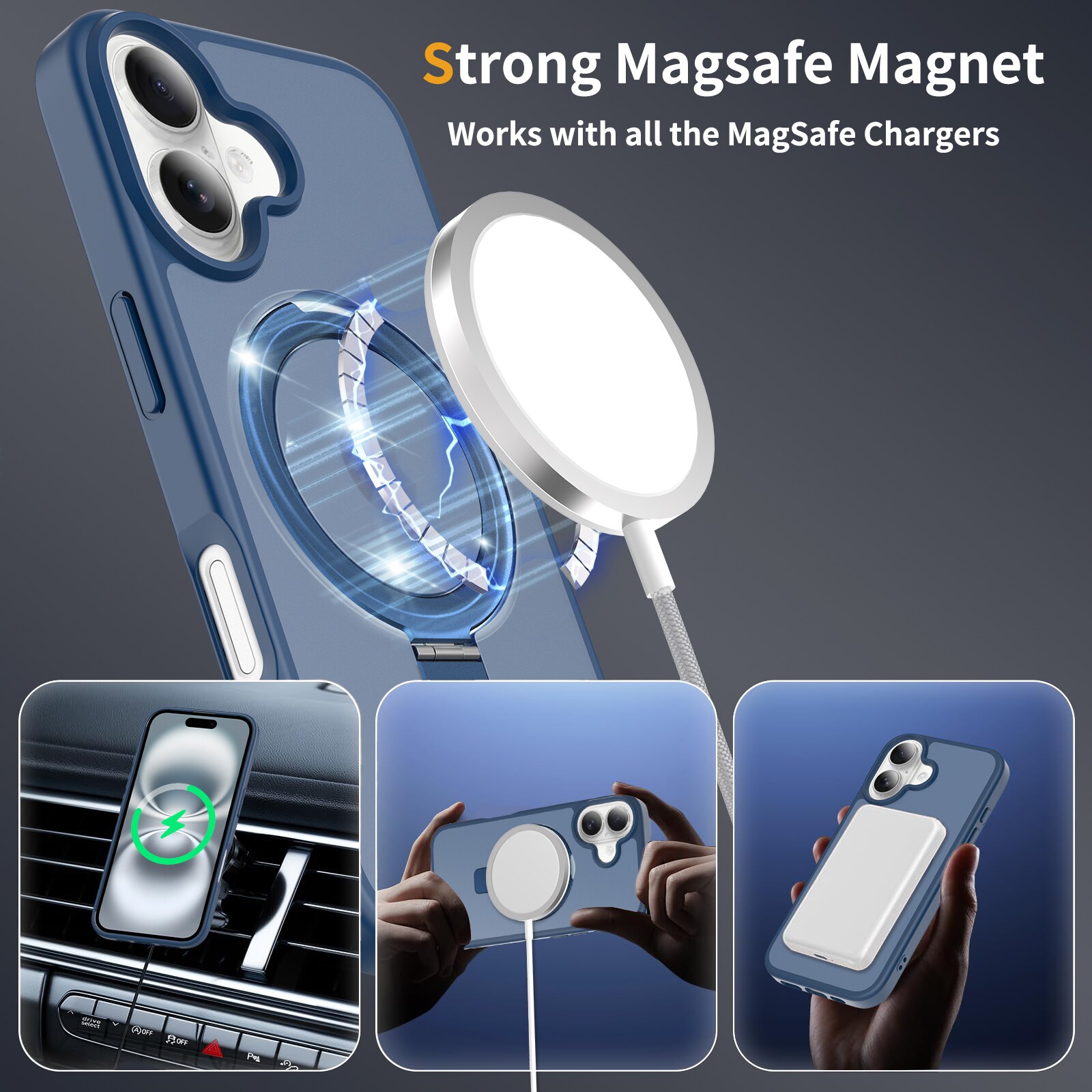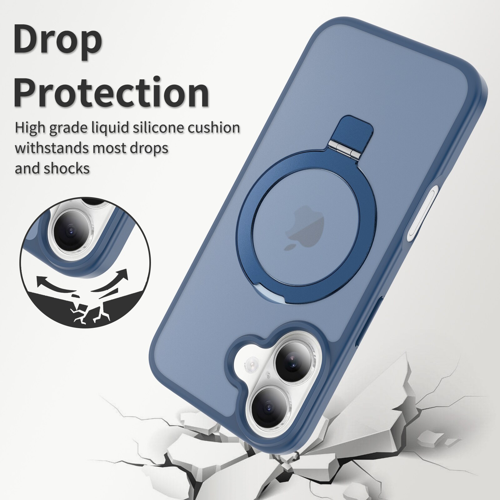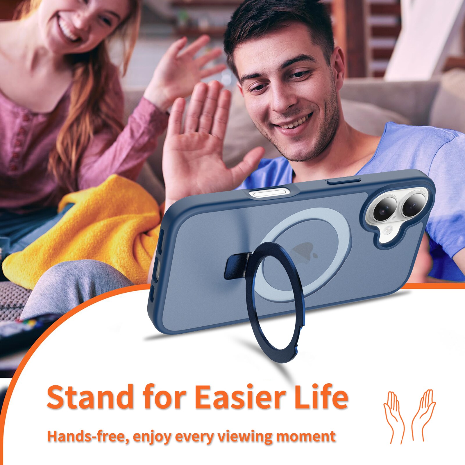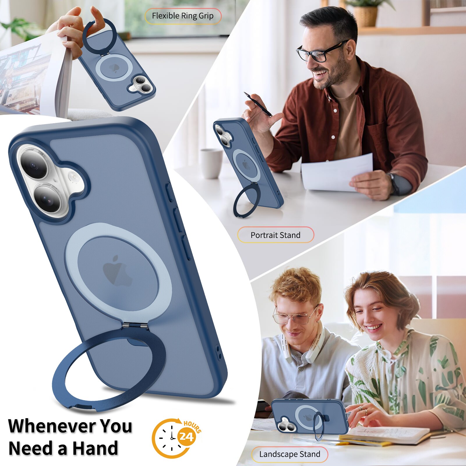 Mobilcover med udtrækkelig magnetisk ring til Apple iPhone 16. For optimal beskyttelse mod stød og tab har coveret et todelt design med en TPU-kerne og en ydre skal i hård plast. Ringen på bagsiden er magnetisk og kan bruges sammen med MagSafe-kompatibelt tilbehør såsom opladere og kortholdere. Ringen kan også fungere som et stativ til at se film, videoer eller spille spil.