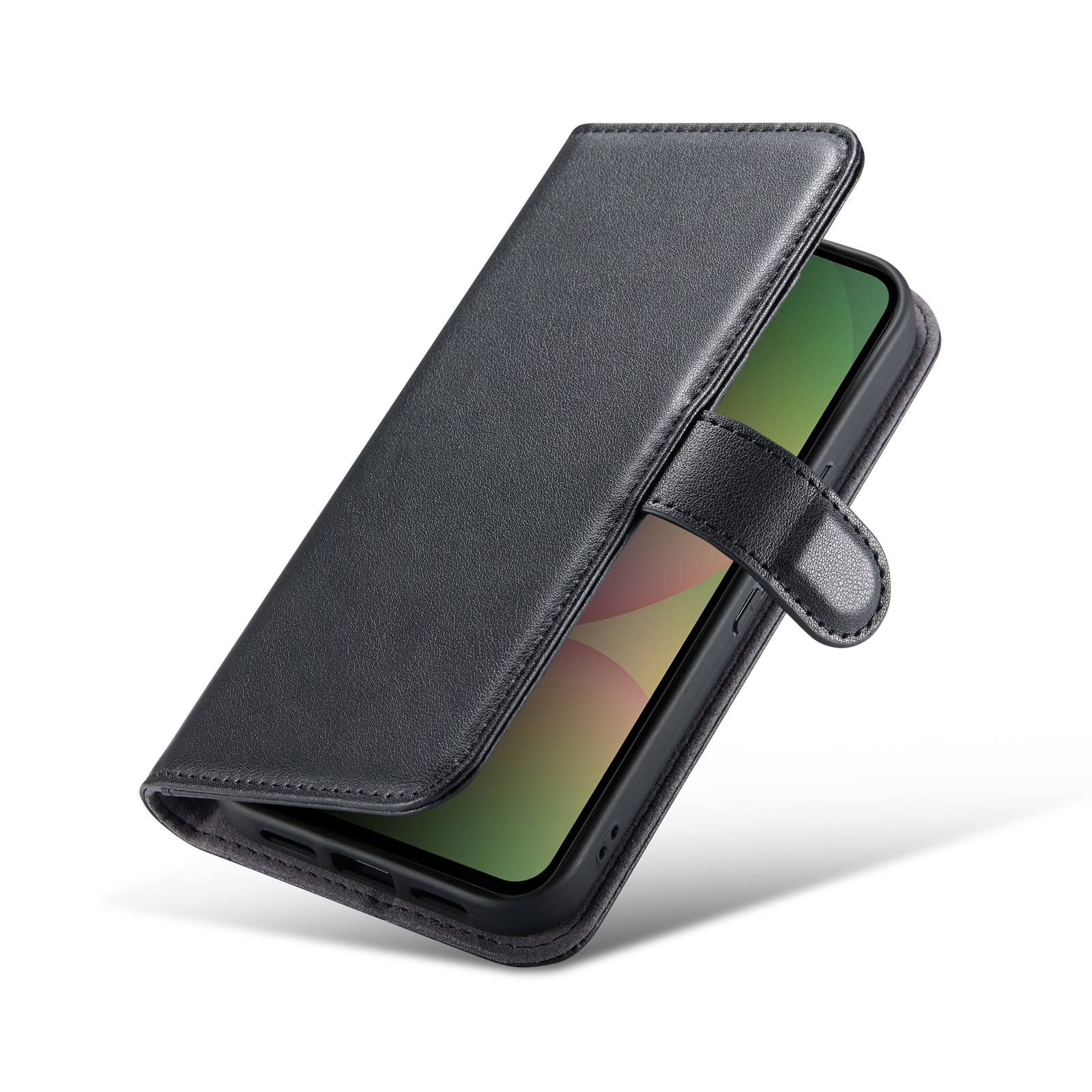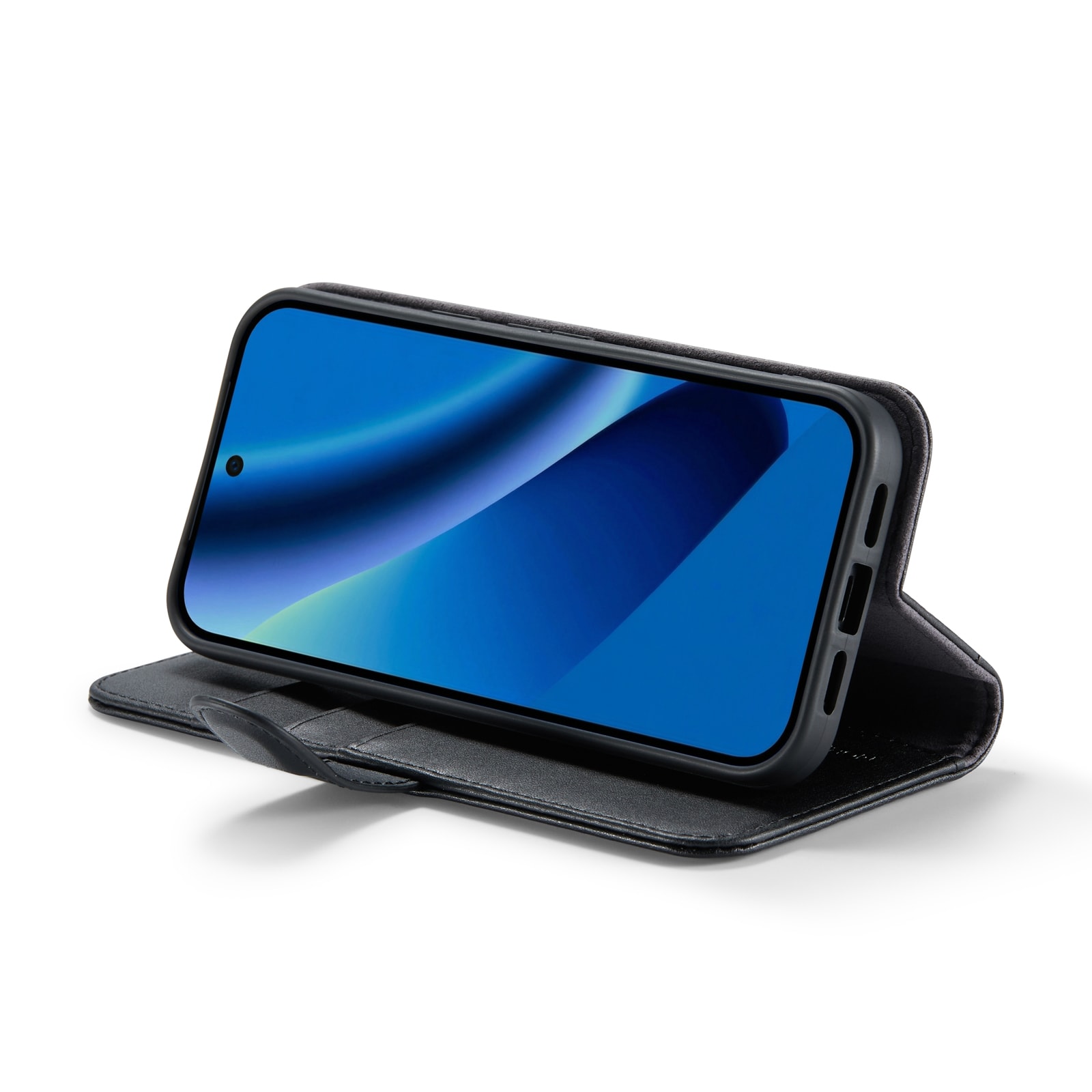 Telefonen sidder sikkert fast i det stødabsorberende TPU-cover, og skjules bag frontcoveret, der holdes lukket med et magnetspænde. På den måde beskyttes både telefonens for- og bagside mod skader.