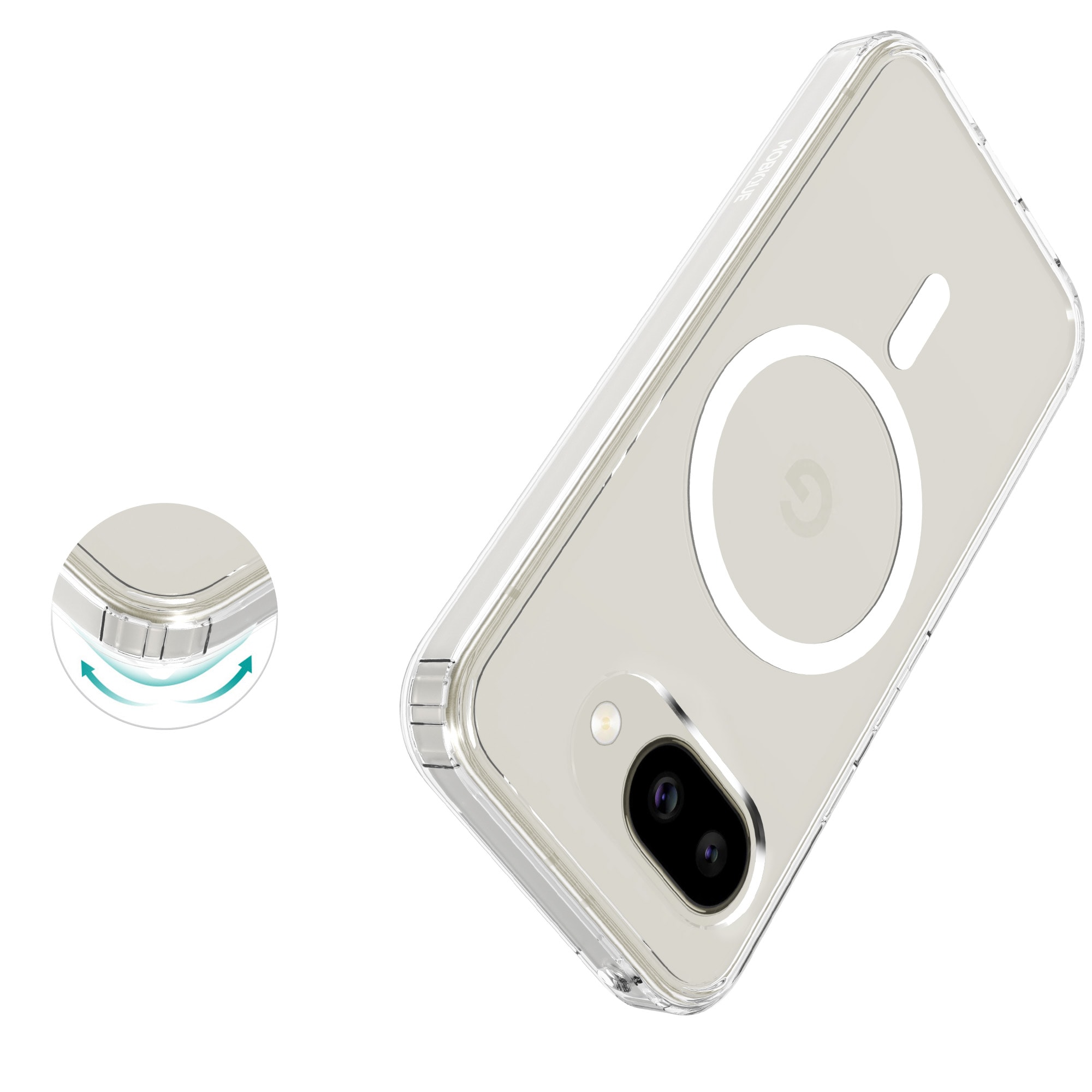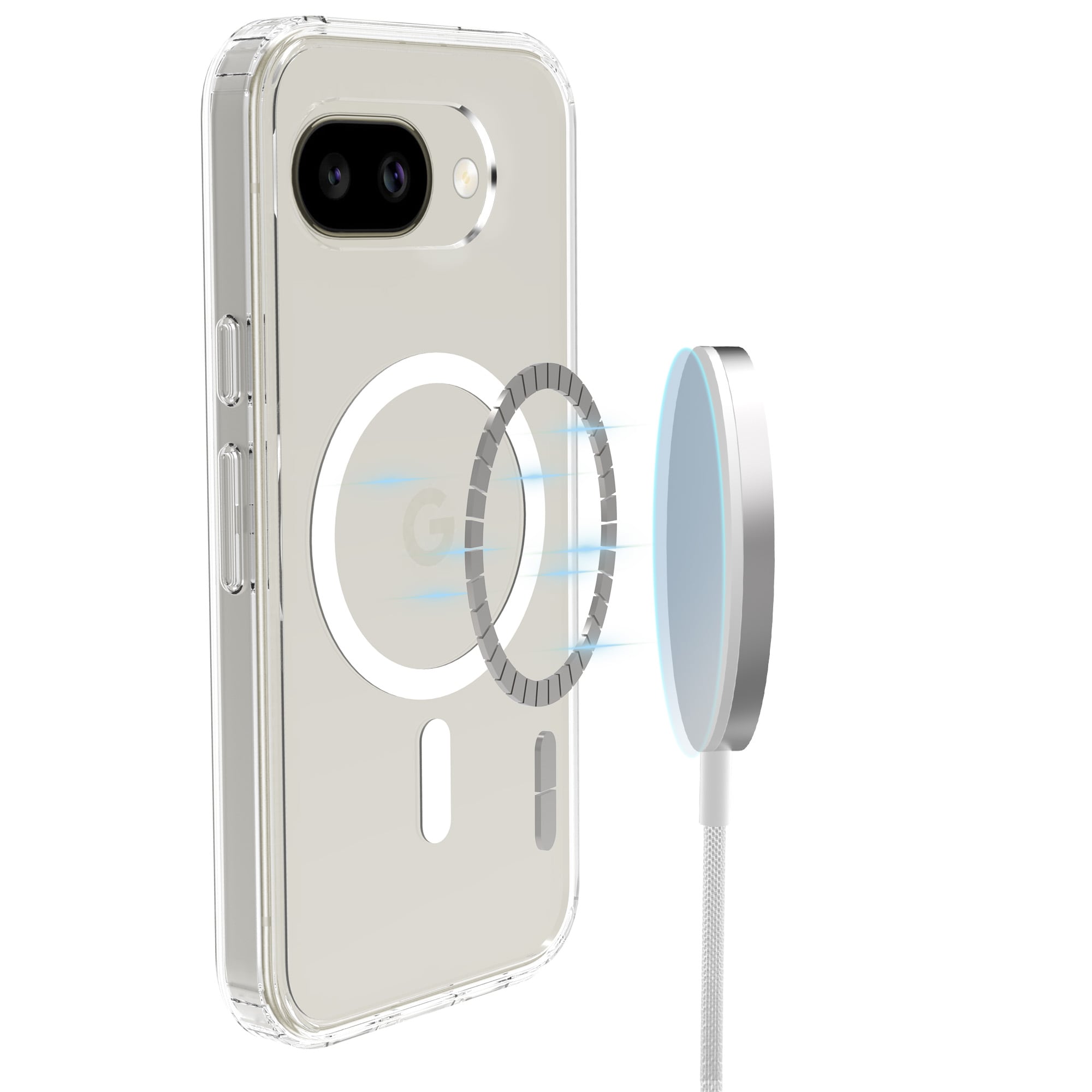 Hybridcover med magnetisk ring til Google Pixel 10a. For optimal beskyttelse mod stød og fald er coveret todelt med en TPU-kerne og et ydre lag af hård plast. Ringen på bagsiden er magnetisk og kan bruges sammen med MagSafe-kompatibelt tilbehør såsom opladere og kortholdere.