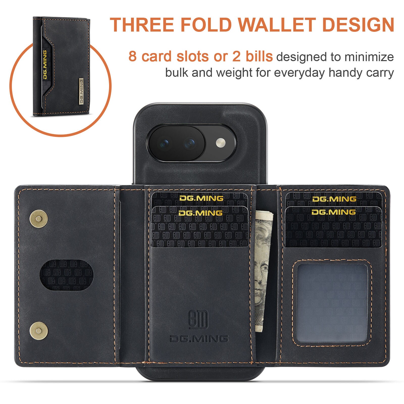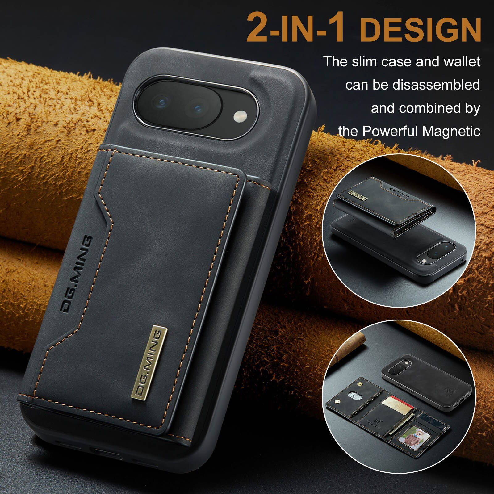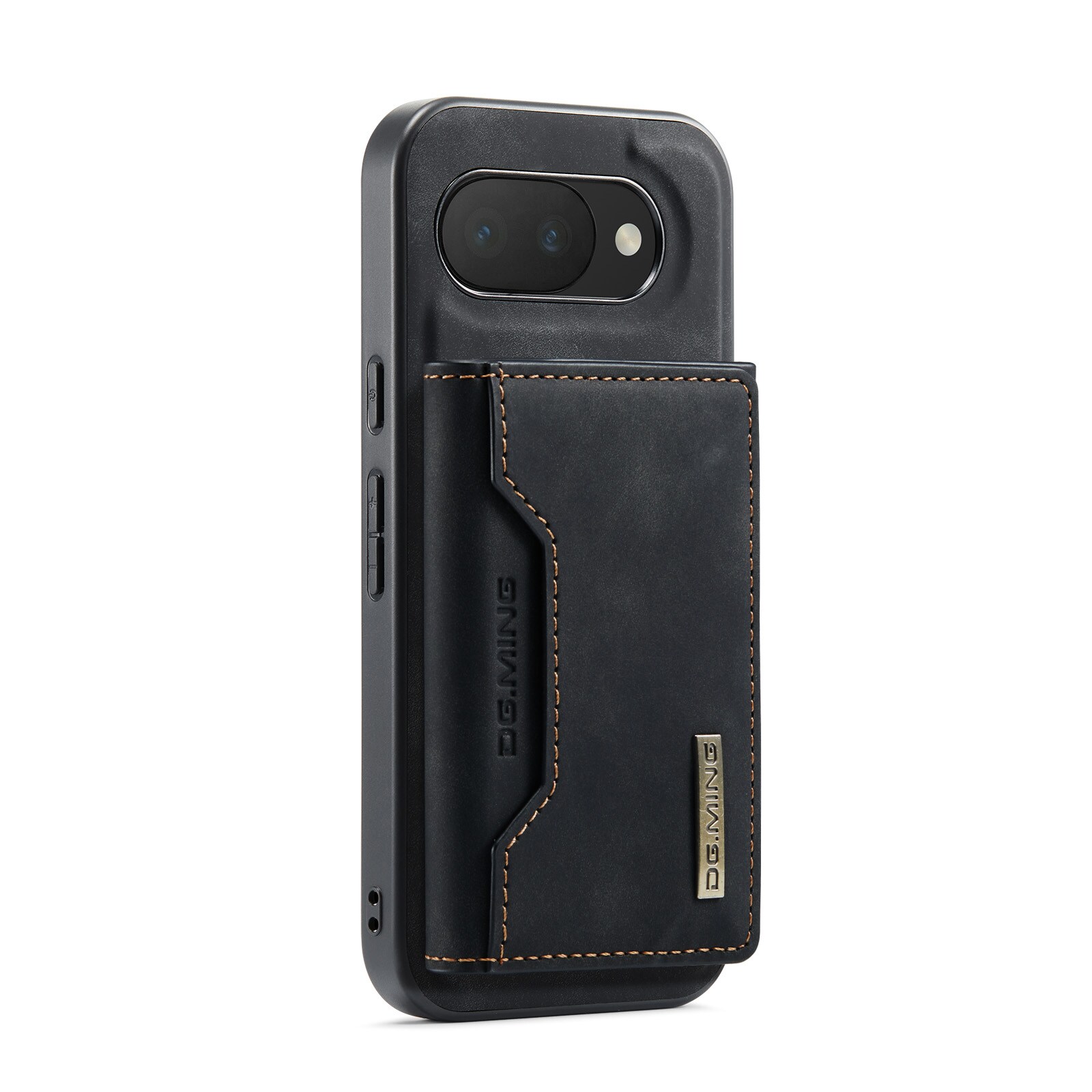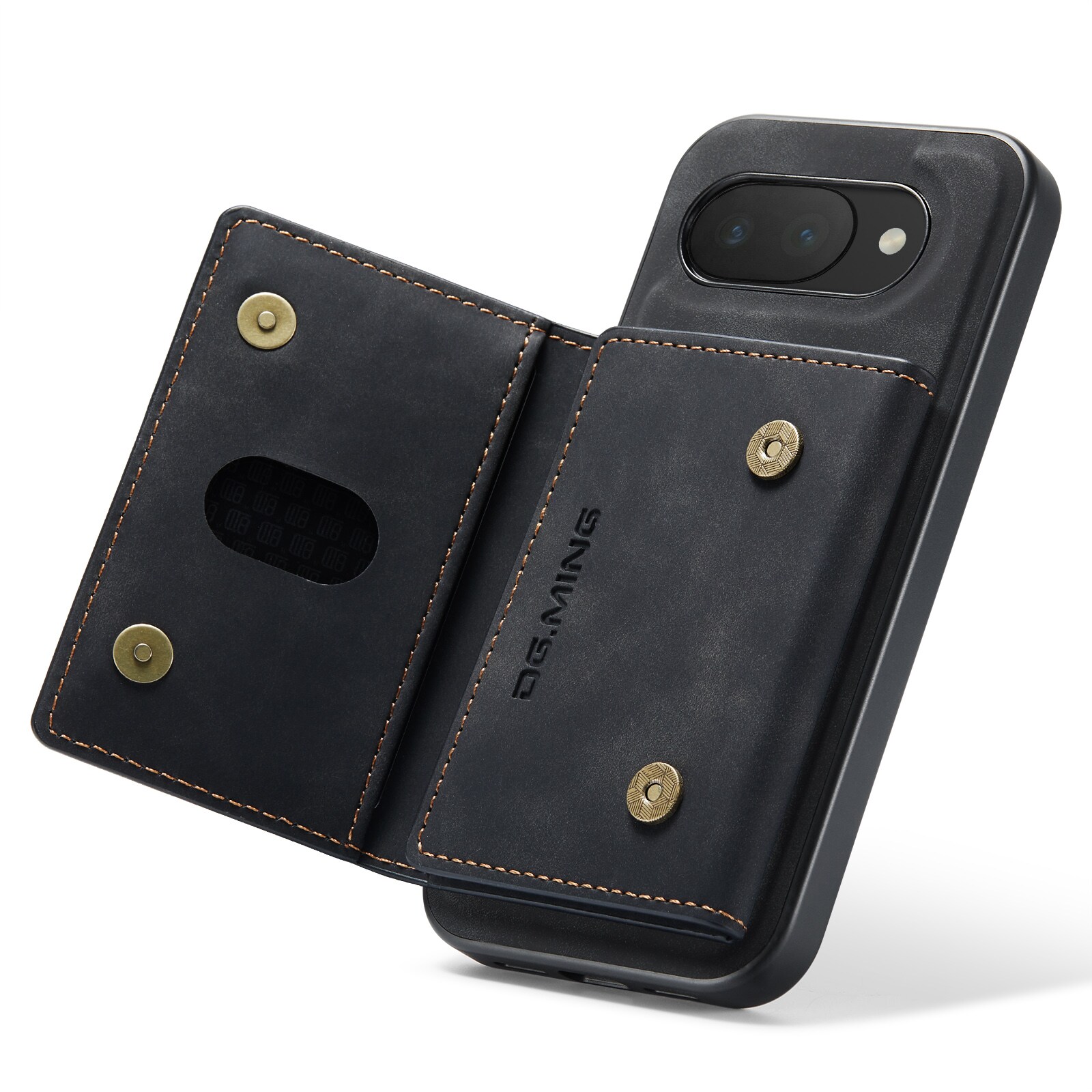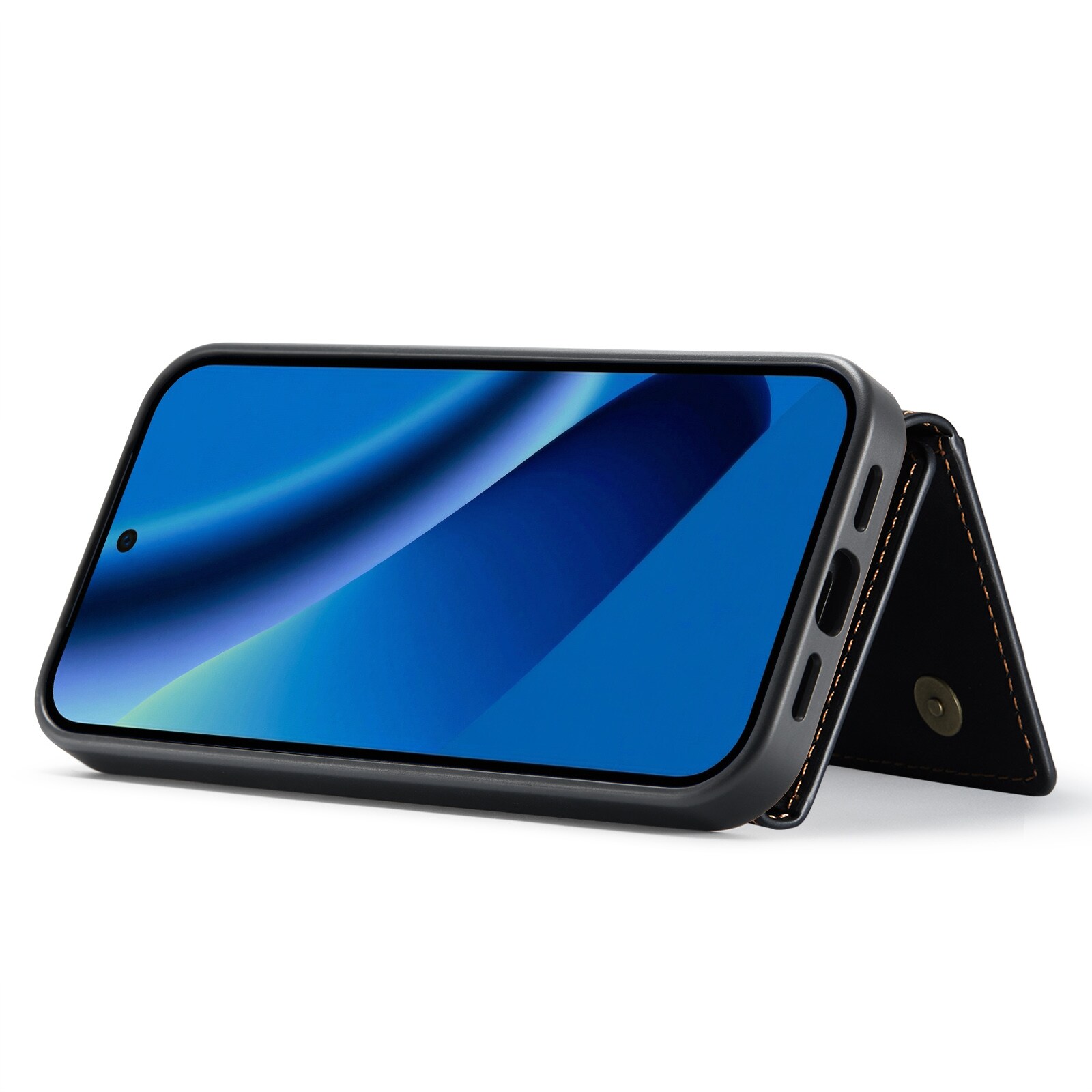 Lædercover til Google Pixel 10a med tilhørende pung. Pungen fastgøres med magneter på bagsiden af coveret og kan nemt tages af, når du ikke har brug for den. Ved at folde pungen ud kan den også bruges som stativ, så du nemt kan se film eller videoer.