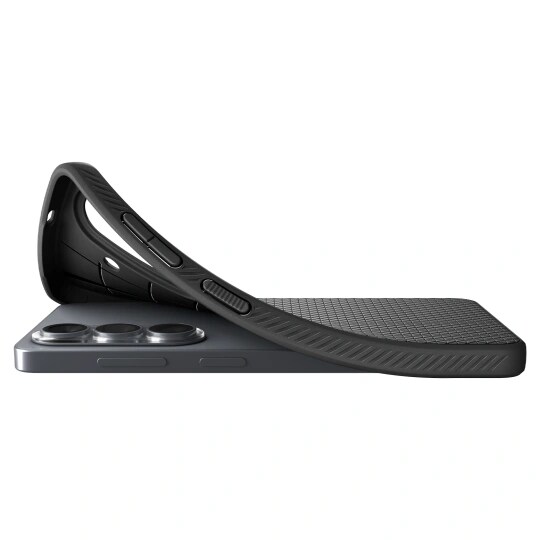 Stødabsorberende Liquid Air-cover fra Spigen. Coveret har et helt unikt design med et geometrisk mønster præget på bagsiden. Coveret er tyndt og udformet, så det følger telefonens form, men giver et endnu bedre greb. Overfladebehandlingen beskytter coveret mod fingeraftryk, snavs og ridser.