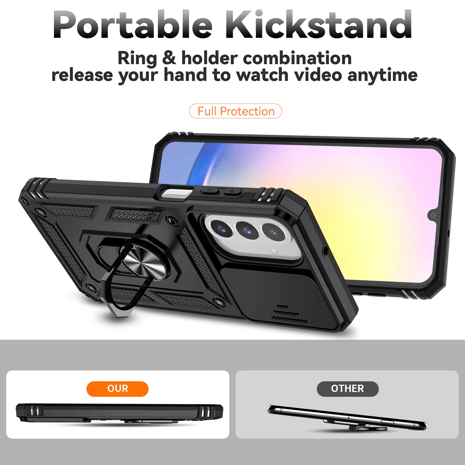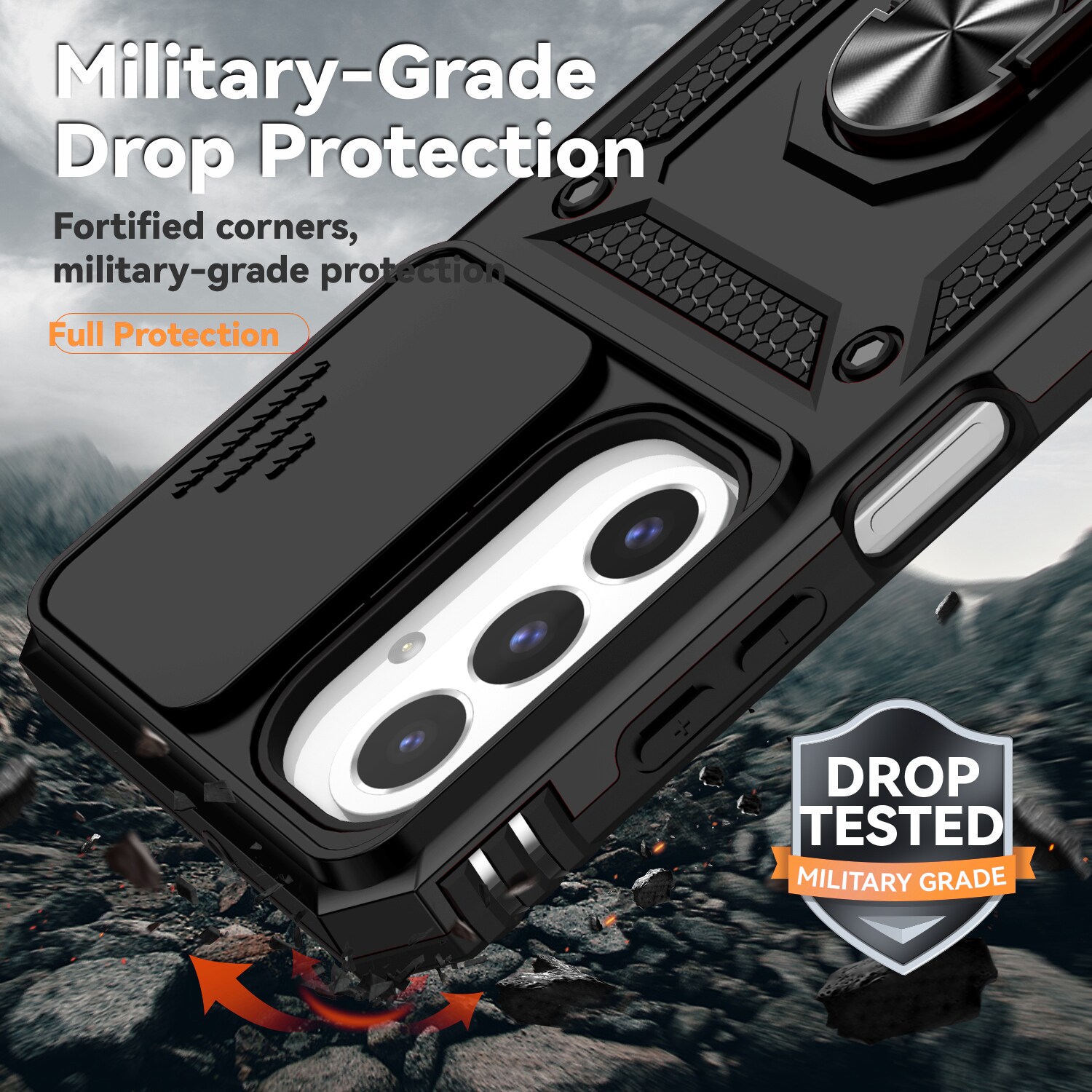 - Støddæmpende hybridcover med kameralåge og grebsring