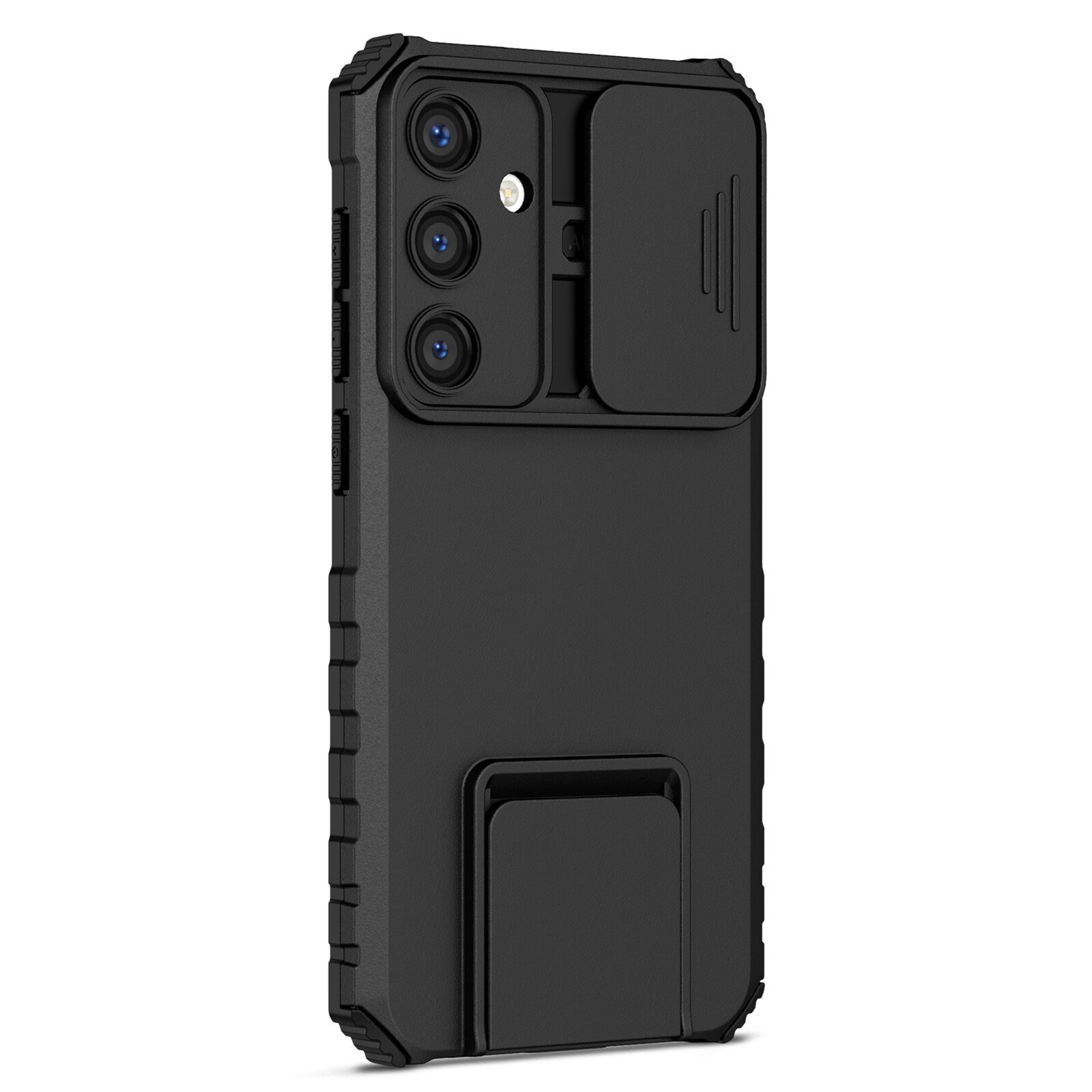Robust cover til Samsung Galaxy A57 med indbygget kameralåg og stativ. Coveret har en todelt konstruktion bestående af en ramme i fleksibel TPU og en ydre skal i hård plast. Kanterne er forstærkede for effektivt at kunne absorbere stød og fald.