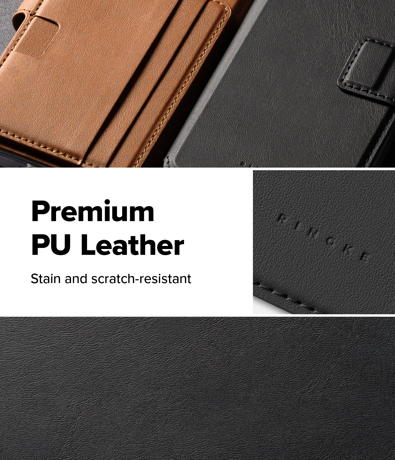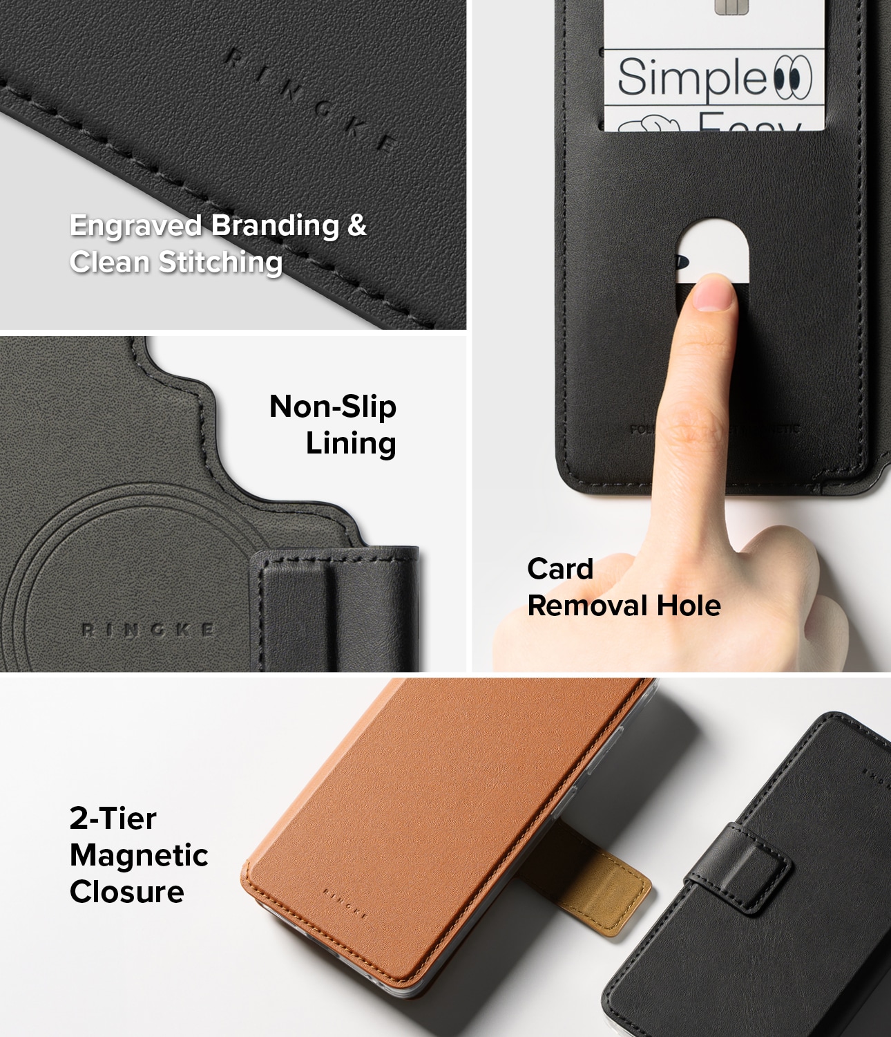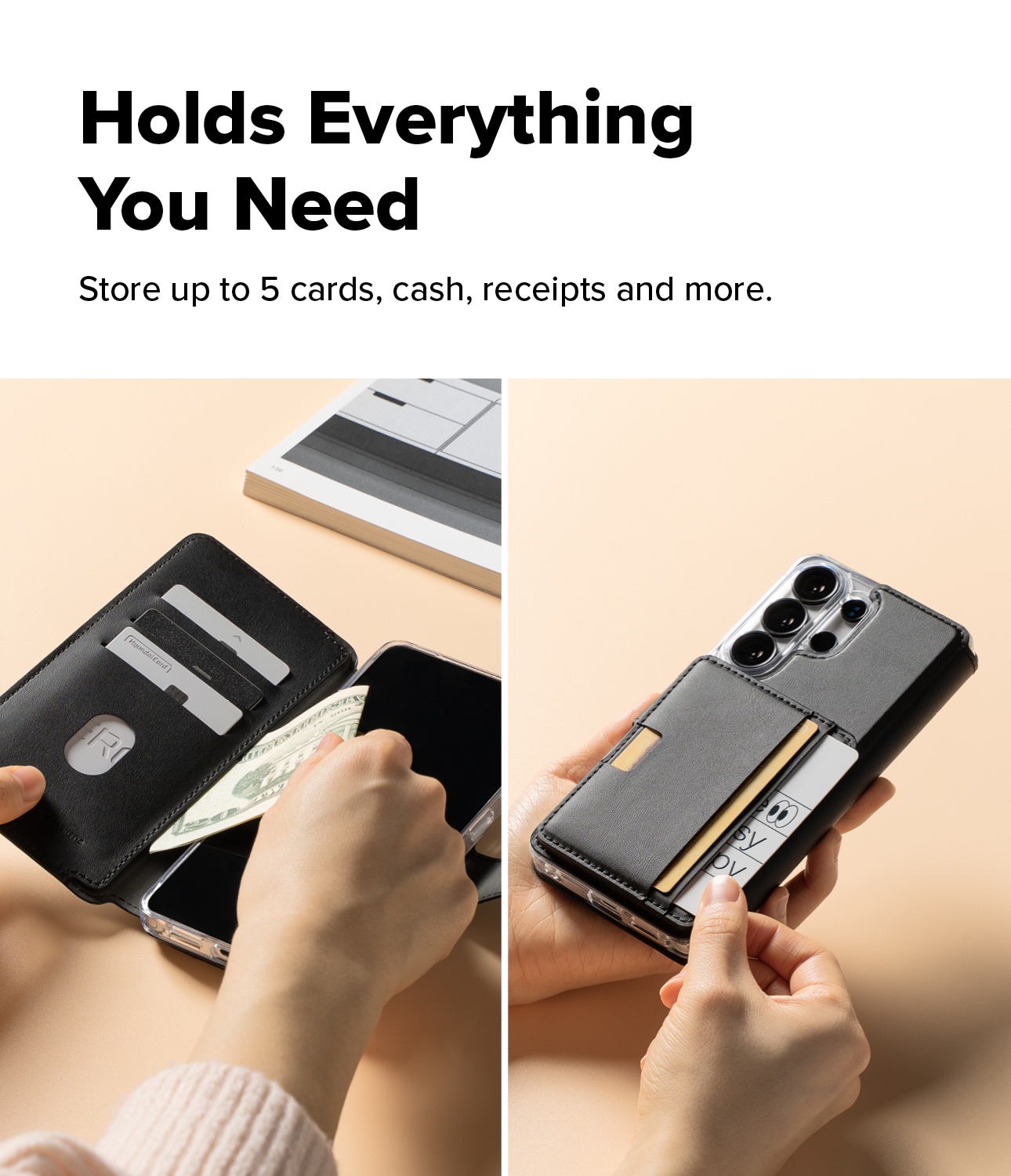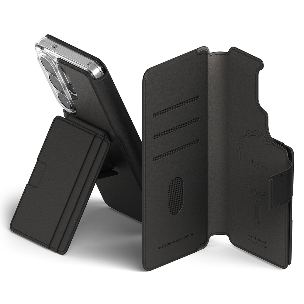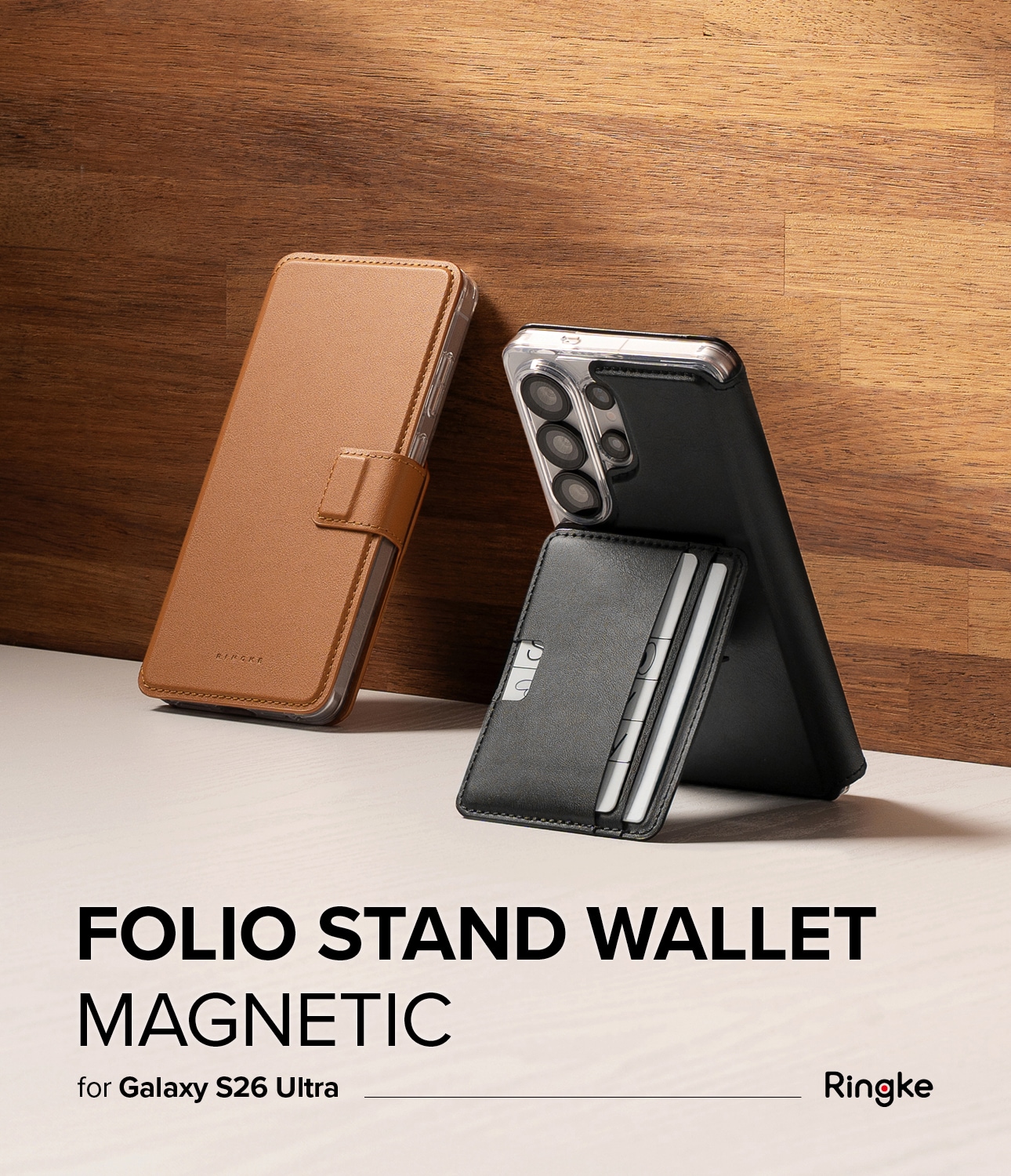 Magnetisk folio-pung med indbygget stativ fra Ringke til Samsung Galaxy S26 Ultra. Pungen fastgøres magnetisk på bagsiden af telefonen eller på et MagSafe-kompatibelt cover. Den har tre kortlommer i folioen samt en rummelig skjult lomme til f.eks. sedler og kvitteringer.