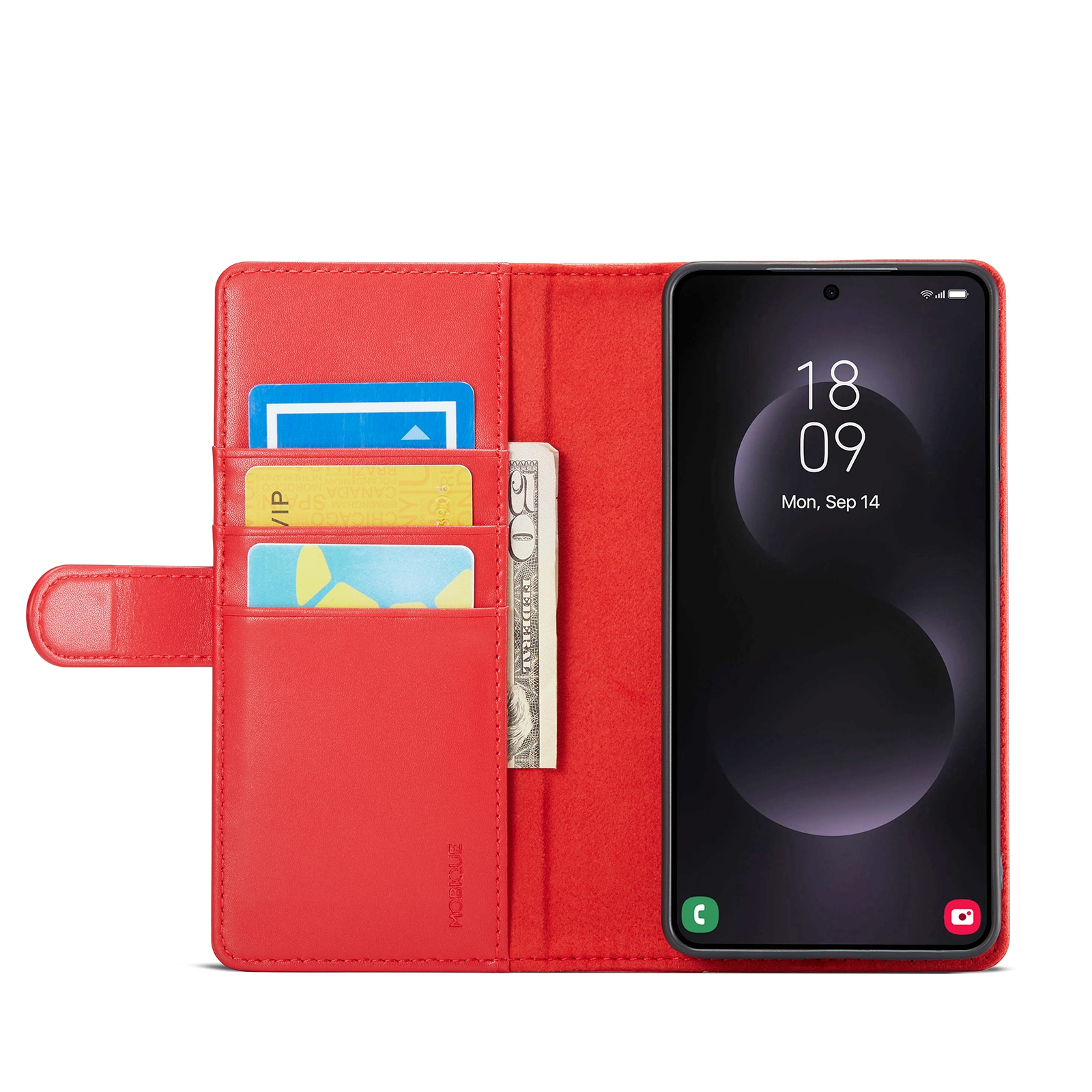Telefonen sidder sikkert fast i det stødabsorberende TPU-cover, og skjules bag frontcoveret, der holdes lukket med et magnetspænde. På den måde beskyttes både telefonens for- og bagside mod skader.