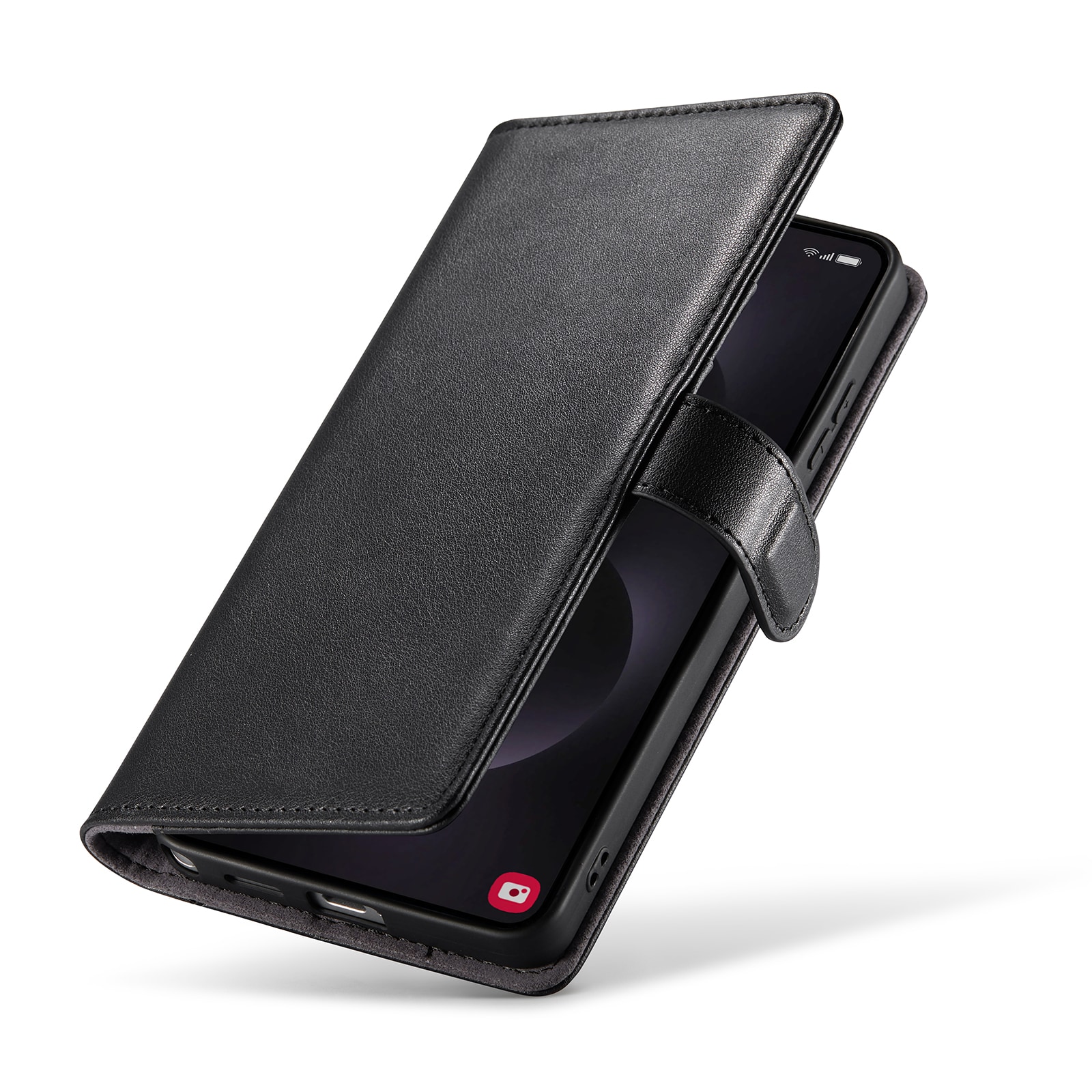 Telefonen sidder sikkert fast i det stødabsorberende TPU-cover, og skjules bag frontcoveret, der holdes lukket med et magnetspænde. På den måde beskyttes både telefonens for- og bagside mod skader.