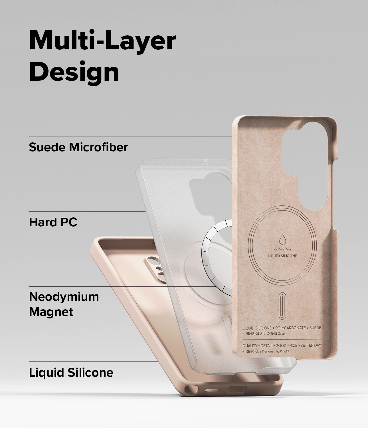 Elegant silikonecover med MagSafe fra Ringke til Samsung Galaxy S26 Ultra. Coveret er stødabsorberende og beskytter mod skader, og med MagSafe-understøttelse kan du bruge MagSafe-tilbehør og oplade med MagSafe - uden at fjerne coveret.