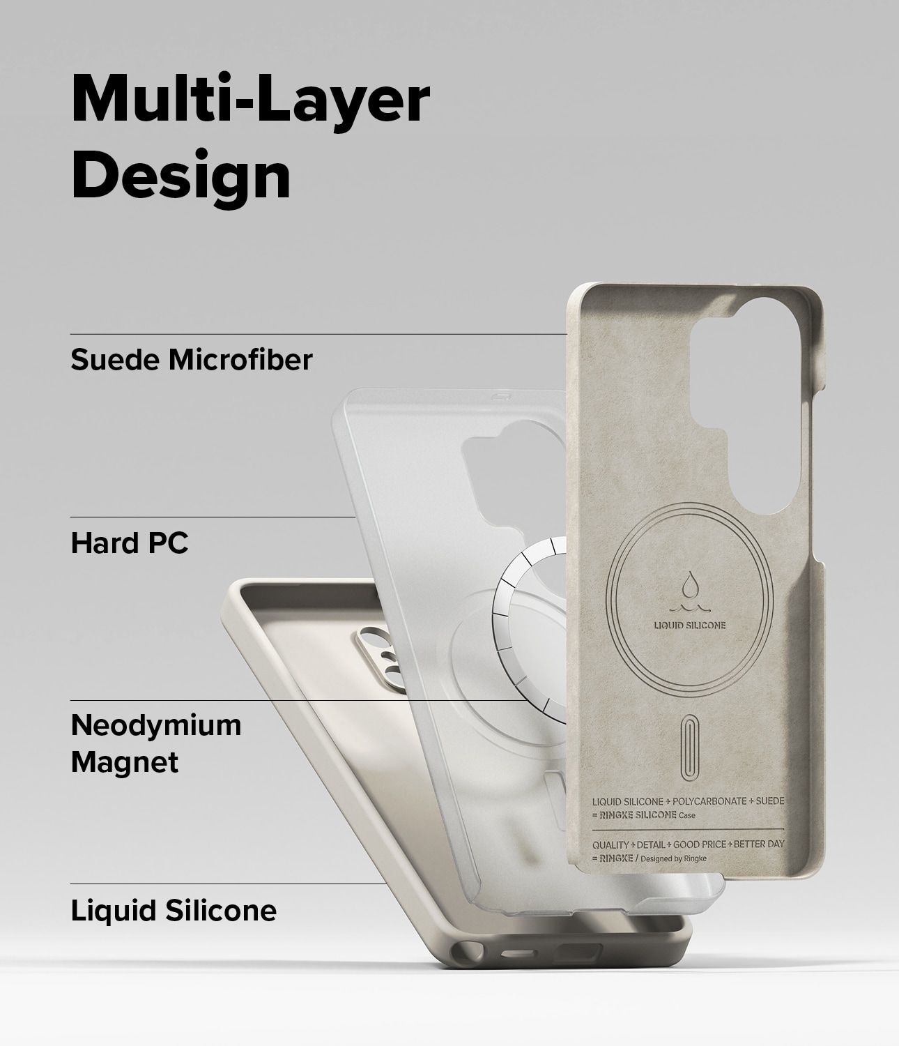 Coveret er opbygget i tre lag for optimal beskyttelse: en ydre skal i slidstærk og grebsvenlig silikone, en hård plastkerne der beskytter mod stød og fald, samt en inderside i mikrofiber, som beskytter mod ridser.