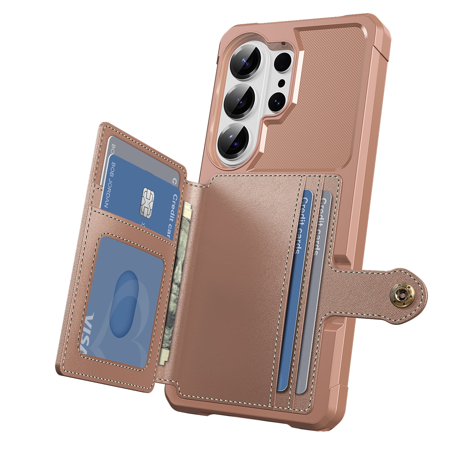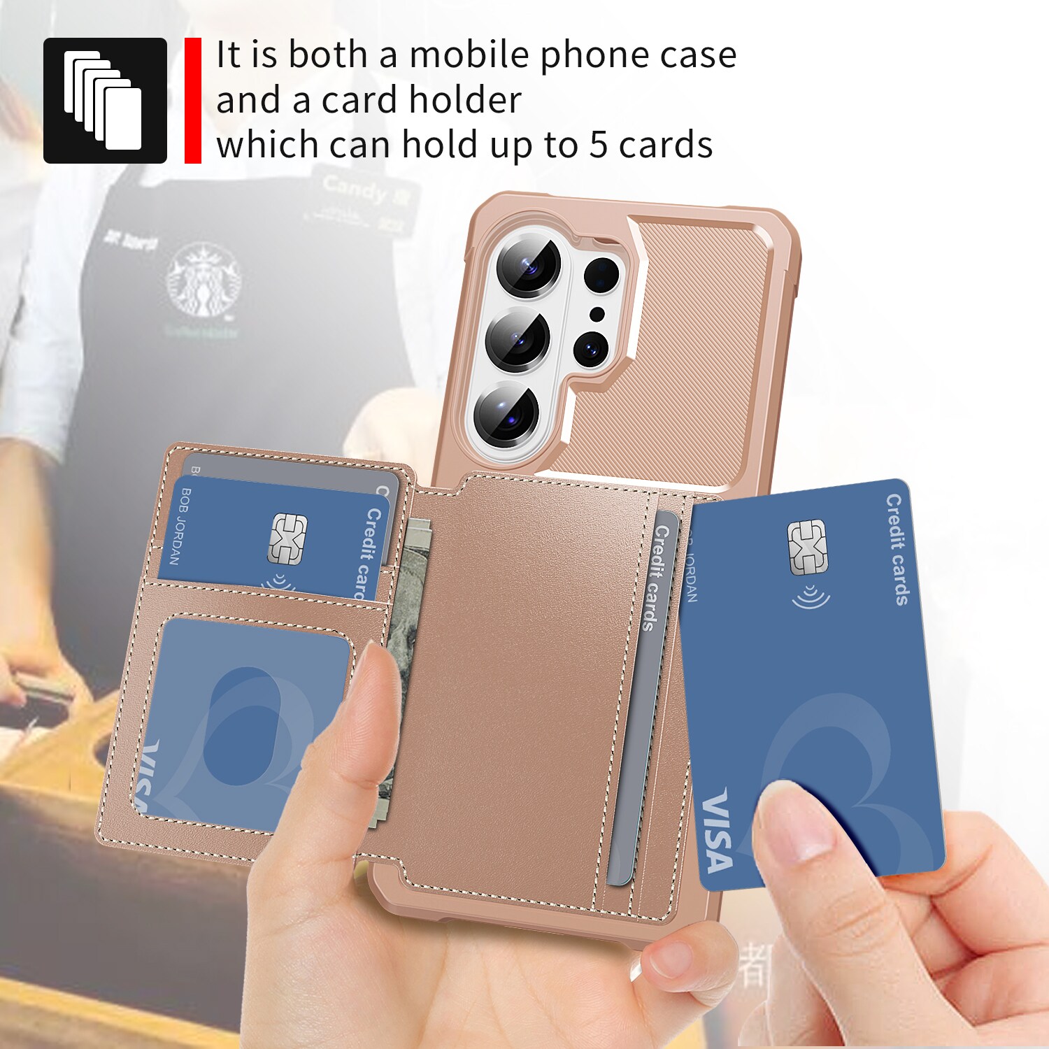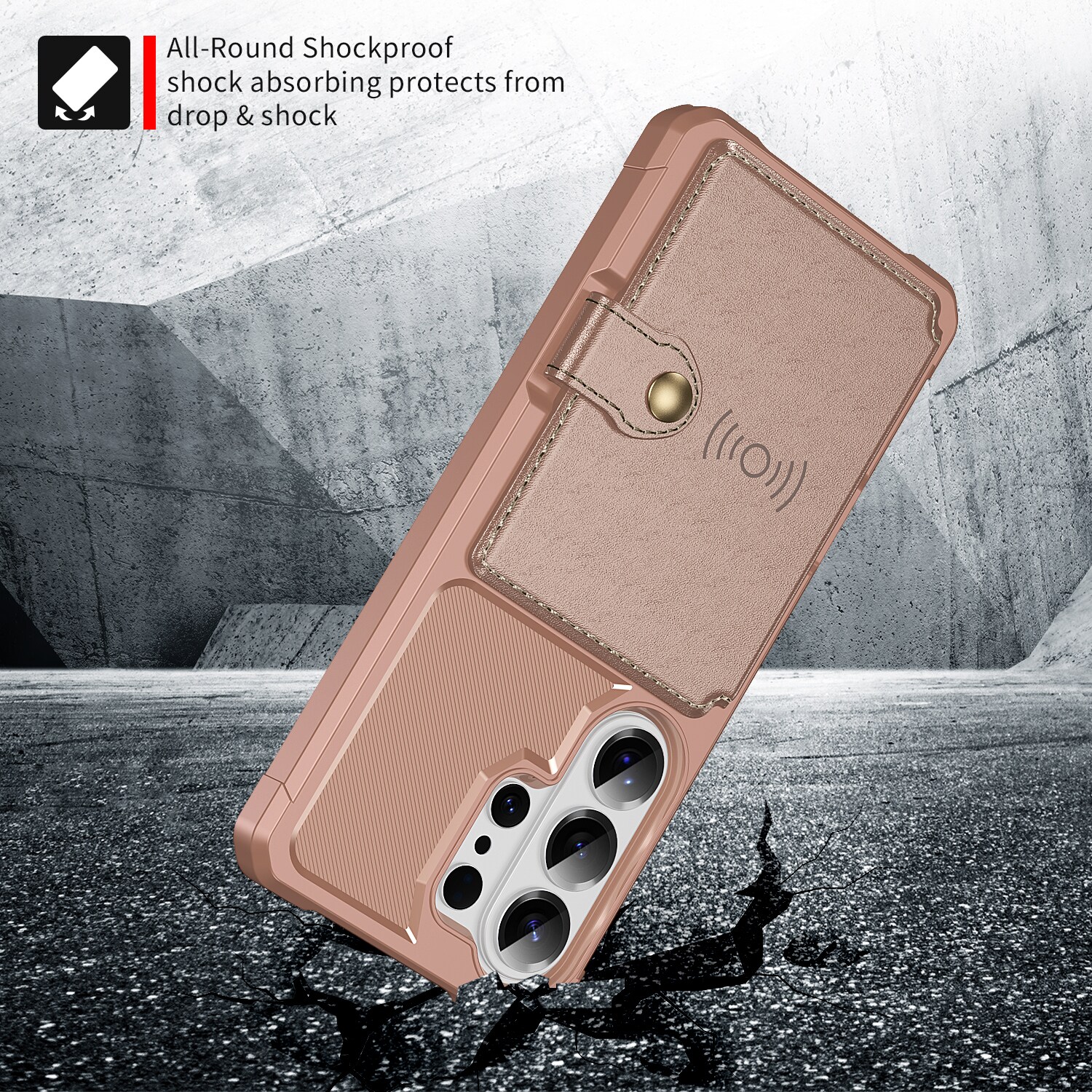 Stødabsorberende mobilcover med skjult kortholder på bagsiden. Coveret har et flot design og forstærkede hjørner for den bedste beskyttelse.