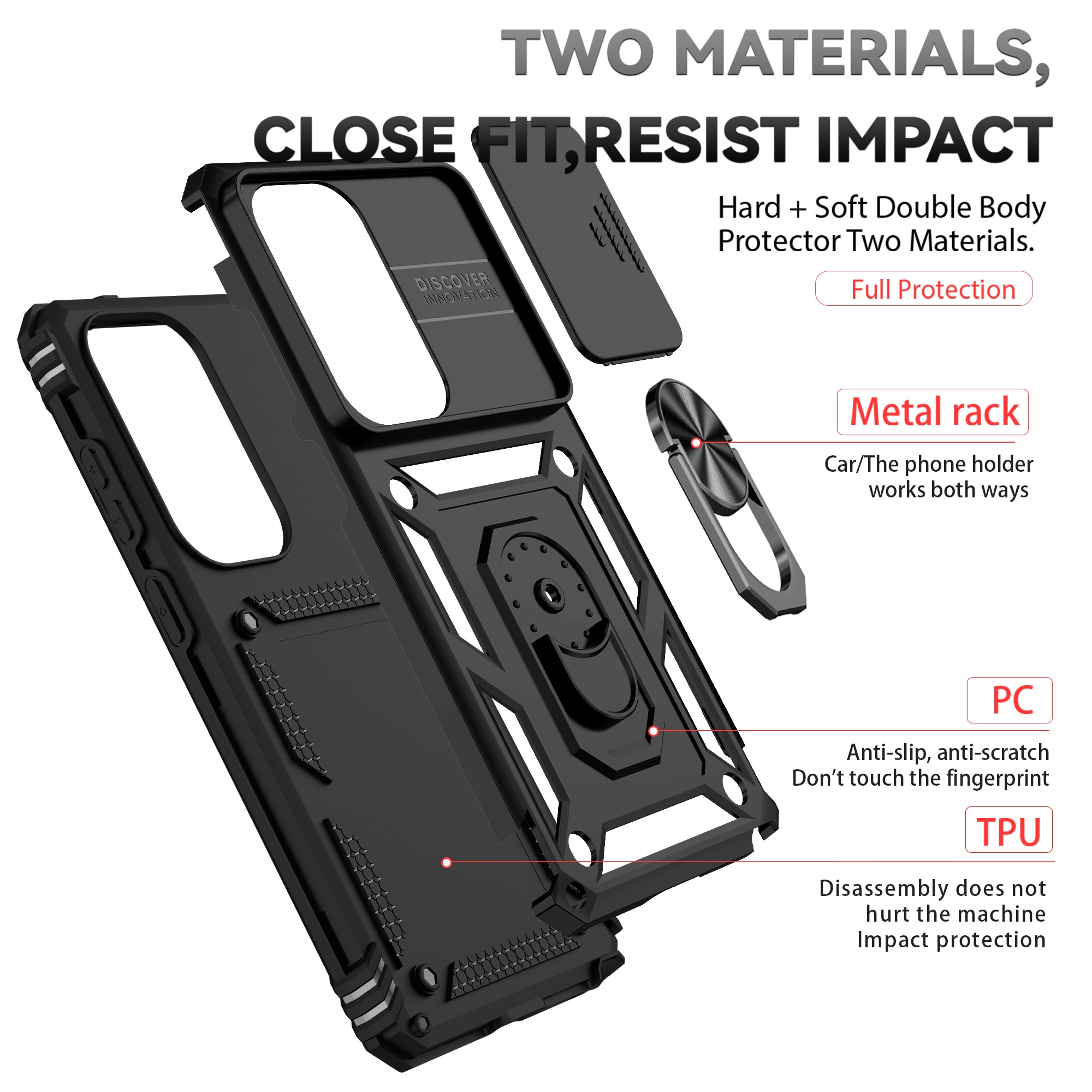 Mobilcover med udtrækkelig ring til Samsung Galaxy S26 Ultra. For optimal beskyttelse mod stød og slag er coveret tredelt med en TPU-kerne, en hård yderskal og en beskyttende ramme omkring skærmen. En kameralåge på bagsiden holder linserne sikre, når du ikke bruger kameraet. Ringen kan trækkes ud for et bedre greb eller fungere som et stativ, når du ser film, klip eller spiller.
