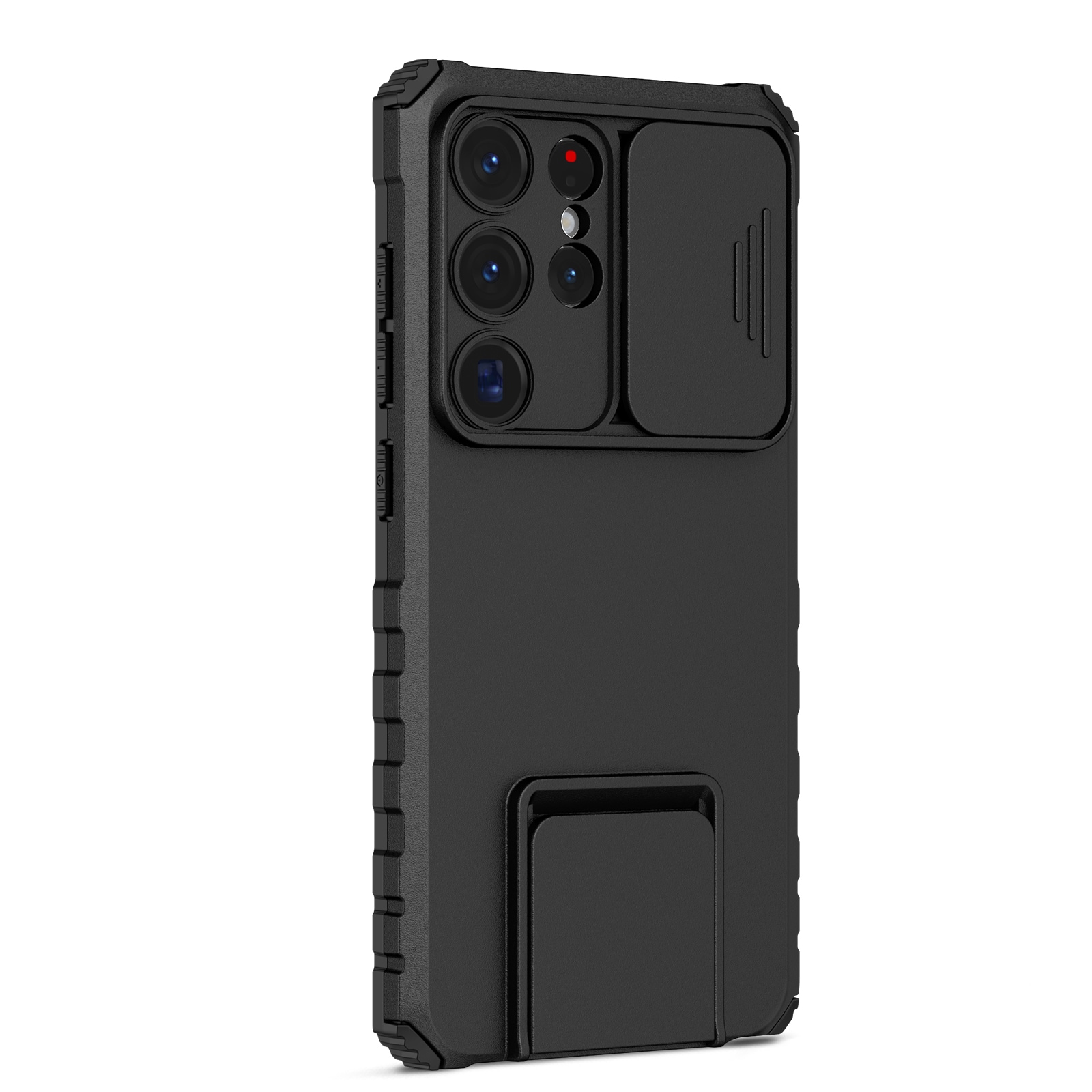 Robust cover til Samsung Galaxy S26 Ultra med indbygget kameralåg og stativ. Coveret har en todelt konstruktion bestående af en ramme i fleksibel TPU og en ydre skal i hård plast. Kanterne er forstærkede for effektivt at kunne absorbere stød og fald.