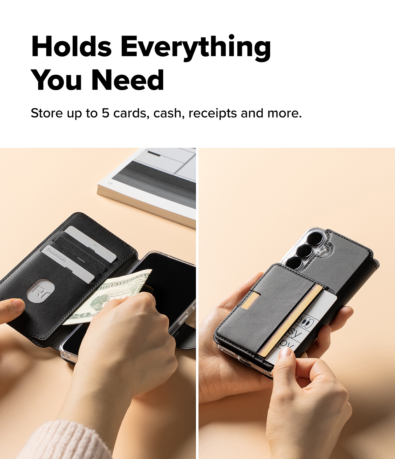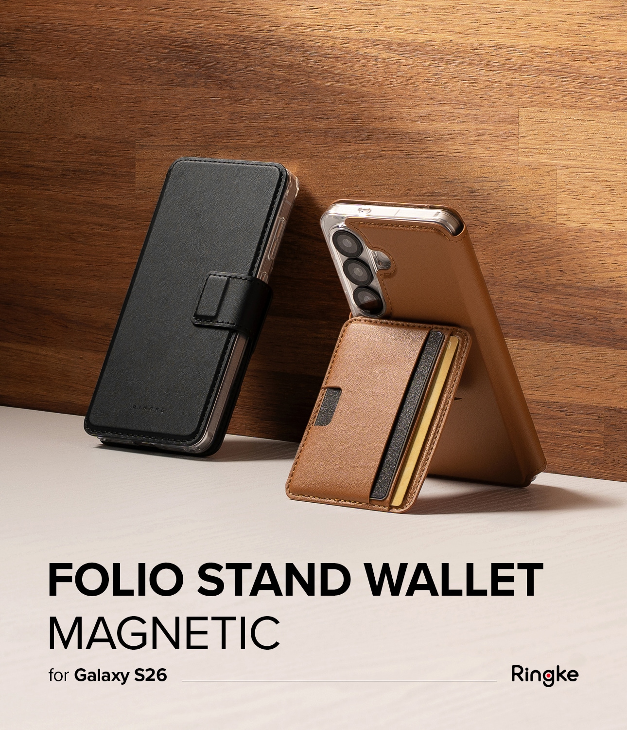 Magnetisk folio-pung med indbygget stativ fra Ringke til Samsung Galaxy S26. Pungen fastgøres magnetisk på bagsiden af telefonen eller på et MagSafe-kompatibelt cover. Den har tre kortlommer i folioen samt en rummelig skjult lomme til f.eks. sedler og kvitteringer.