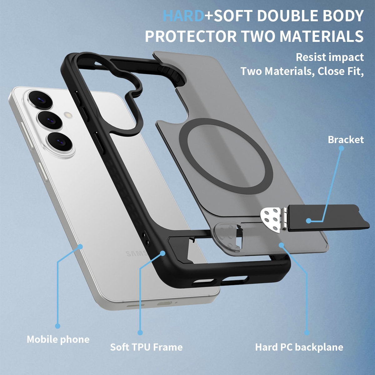 Smart og praktisk hybridcover med indbygget stativ til Samsung Galaxy S26. Coveret beskytter din telefon mod stød og ridser med en slidstærk kombination af hård plast og fleksibel TPU. Det udklappelige stativ gør det nemt at se film, videoer eller spille - helt handsfree.
