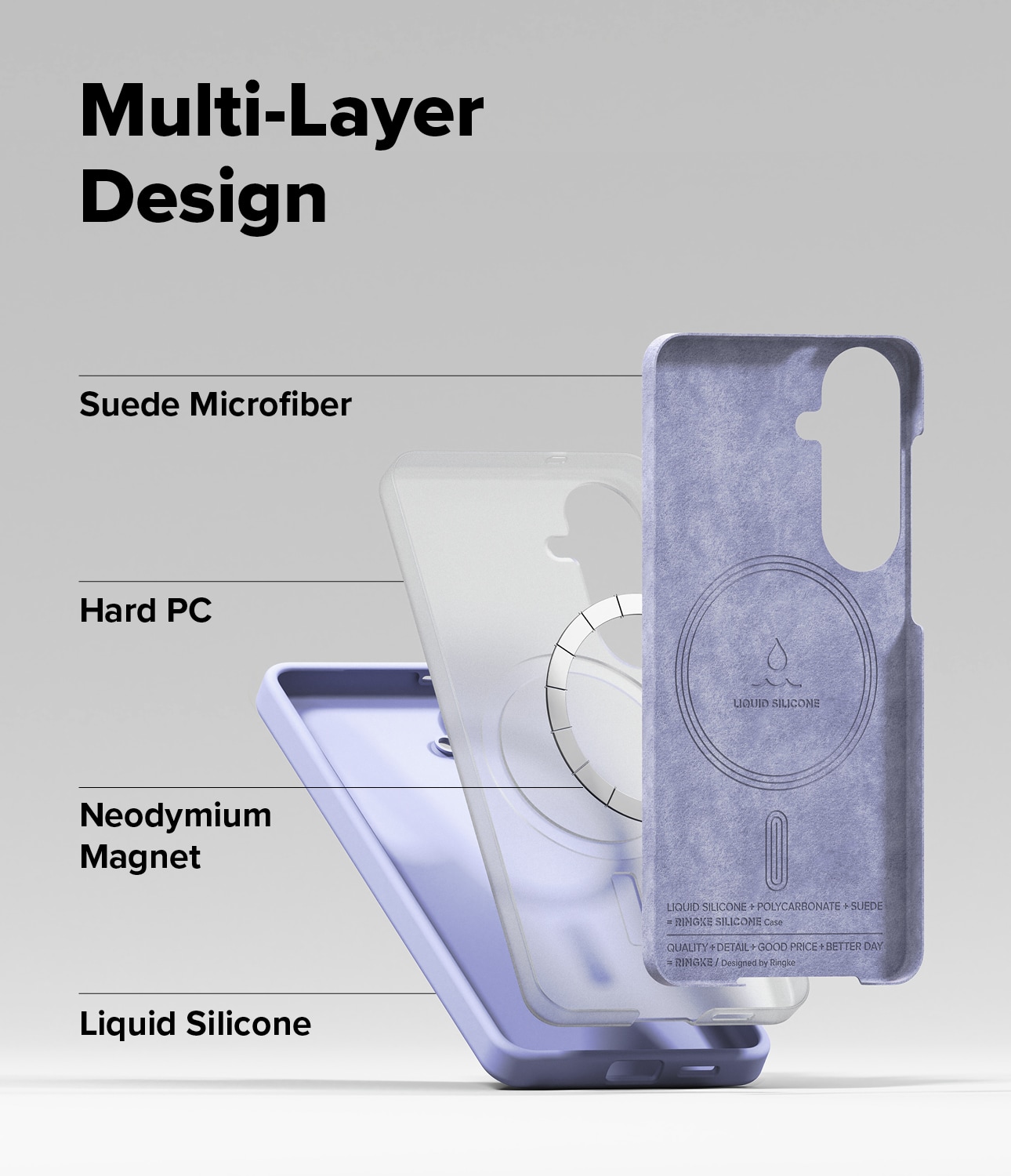 Coveret er opbygget i tre lag for optimal beskyttelse: en ydre skal i slidstærk og grebsvenlig silikone, en hård plastkerne der beskytter mod stød og fald, samt en inderside i mikrofiber, som beskytter mod ridser.
