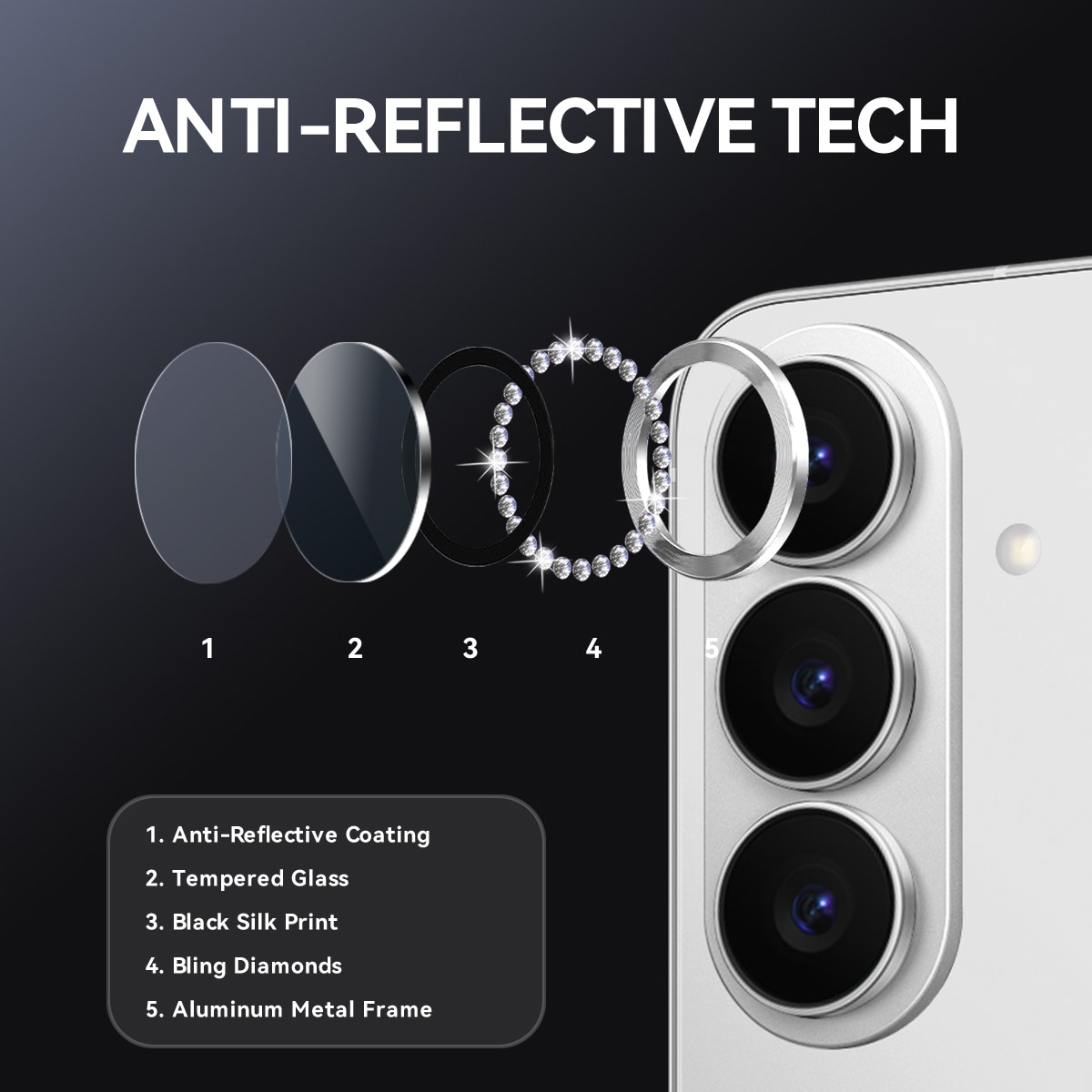 Beskyt kameralinserne på din Samsung Galaxy S26 med en linsebeskytter i hærdet glas med glitrende rhinsten fra Northjo. Den giver pålidelig beskyttelse mod ridser og stød, samtidig med at kameraet får et elegant og eksklusivt udtryk. Det heldækkende design beskytter hele linsen uden at påvirke billedkvaliteten.