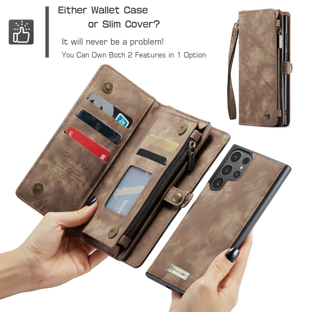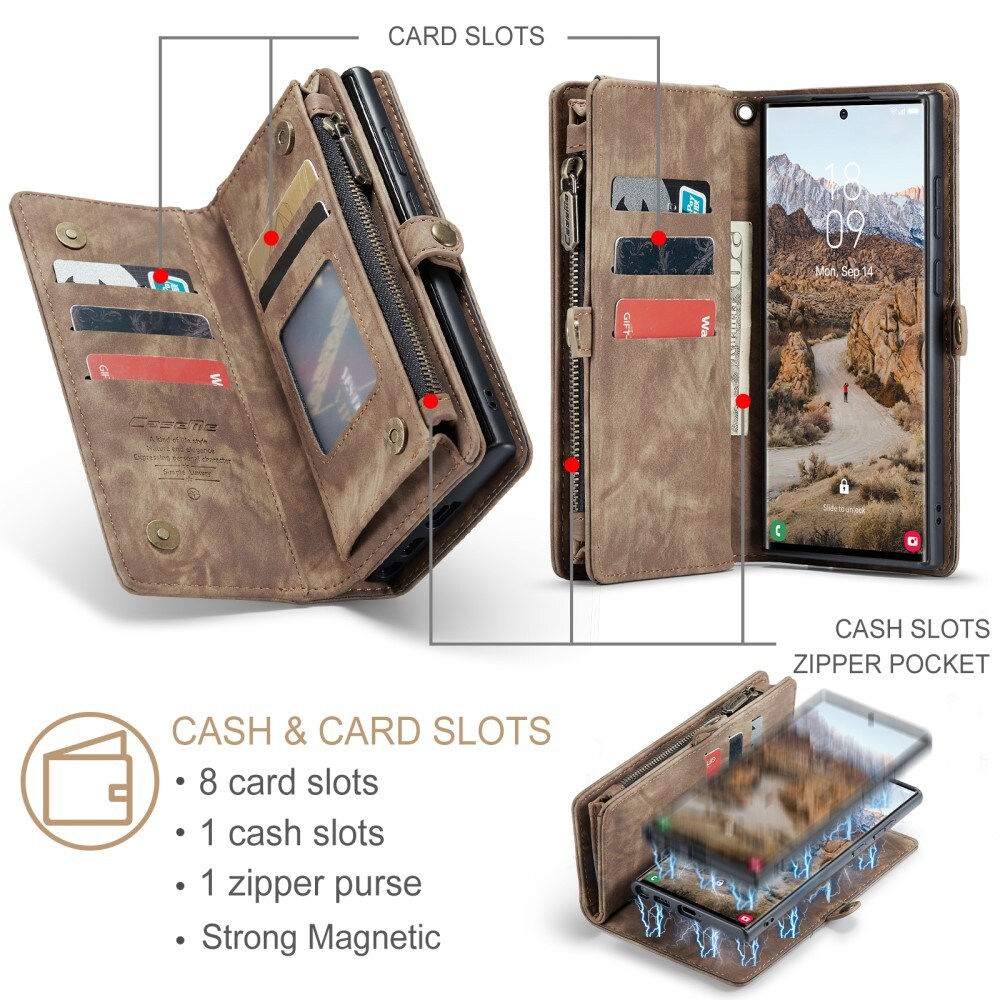 Mobiletui med magnetcover og tegnebog med ekstra mange kortrum fra CaseMe. Denne rummelige tegnebog har en seddellomme, lynlås til mønter og flere kortpladser.