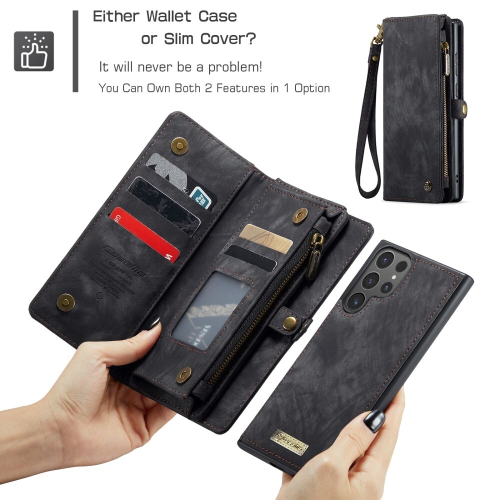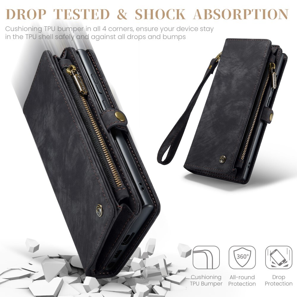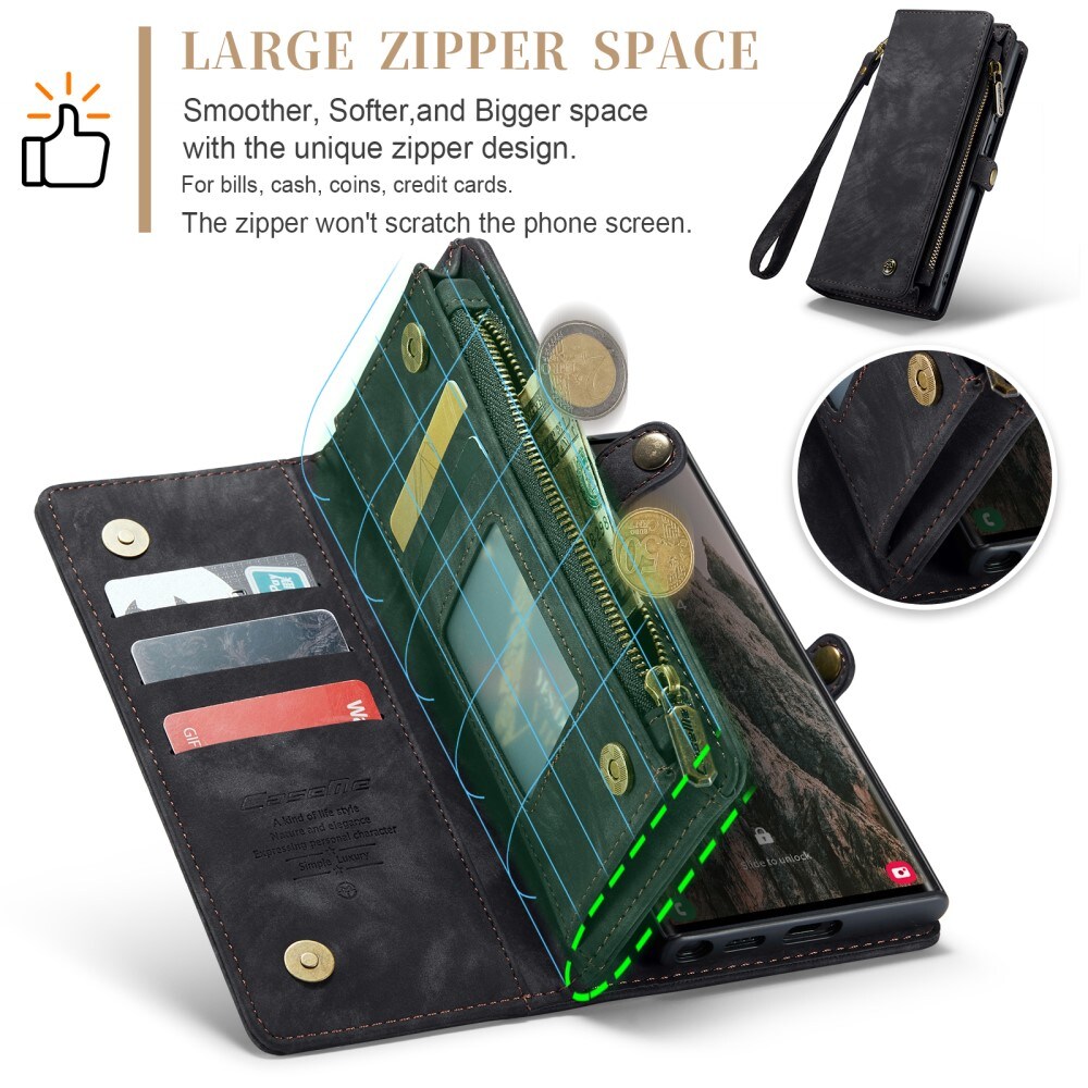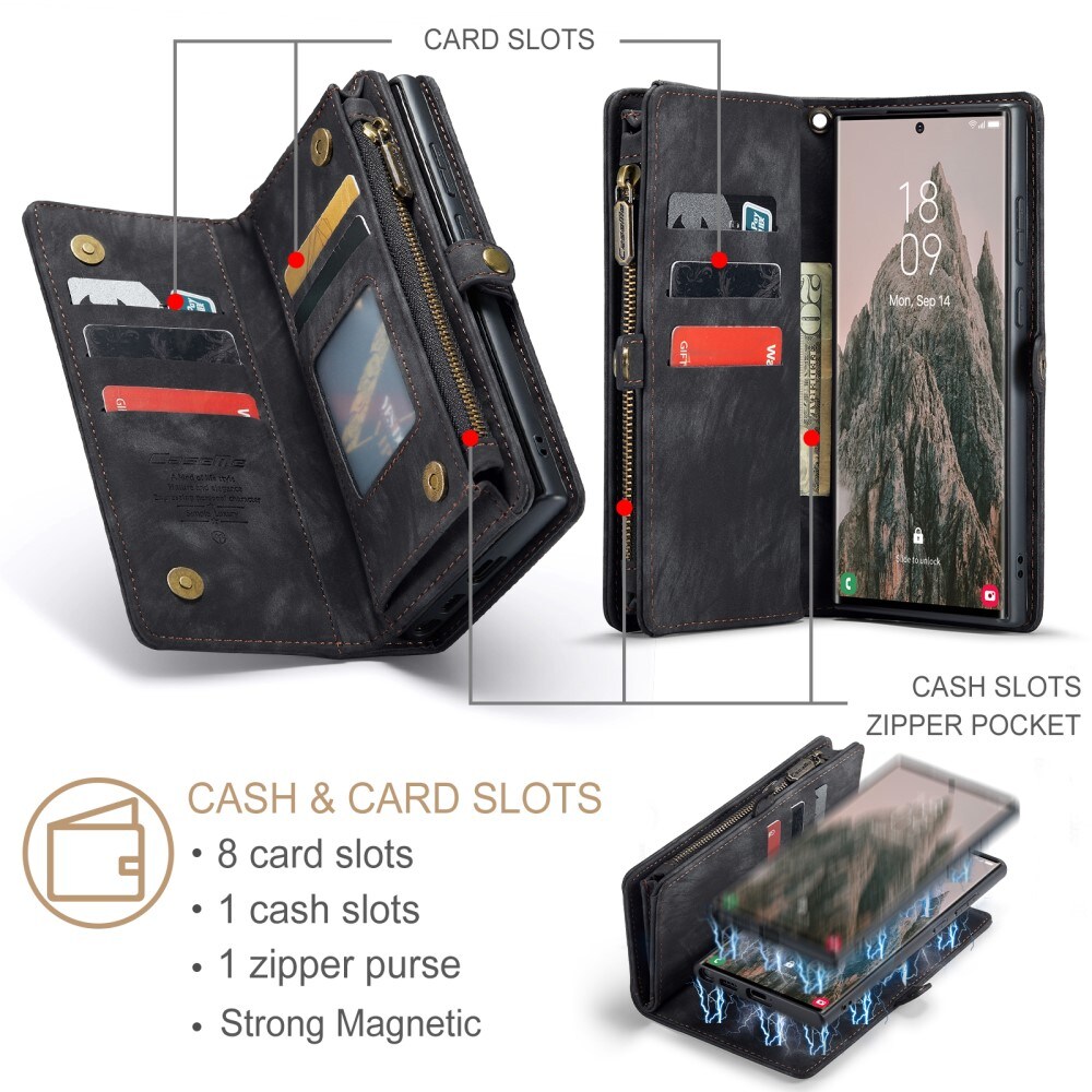Mobiletui med magnetcover og tegnebog med ekstra mange kortrum fra CaseMe. Denne rummelige tegnebog har en seddellomme, lynlås til mønter og flere kortpladser.