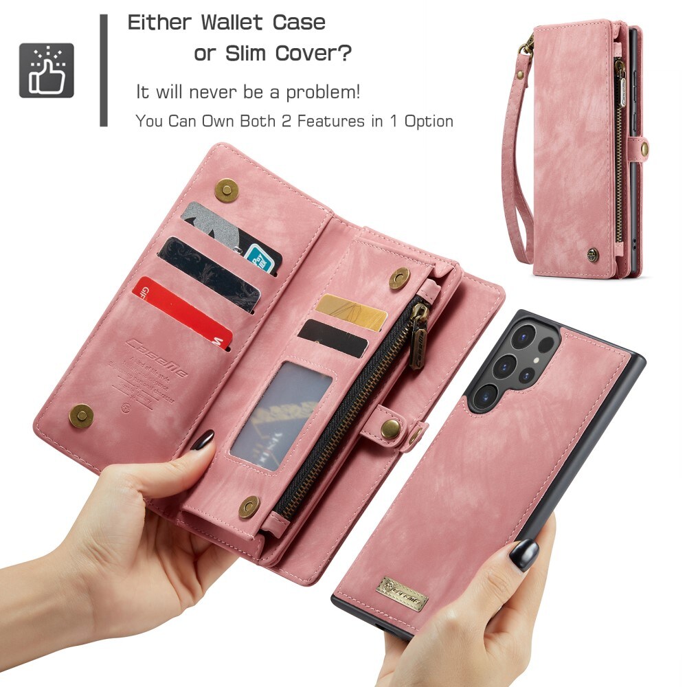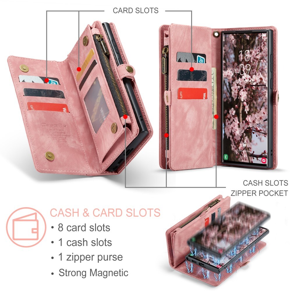 Mobiletui med magnetcover og tegnebog med ekstra mange kortrum fra CaseMe. Denne rummelige tegnebog har en seddellomme, lynlås til mønter og flere kortpladser.