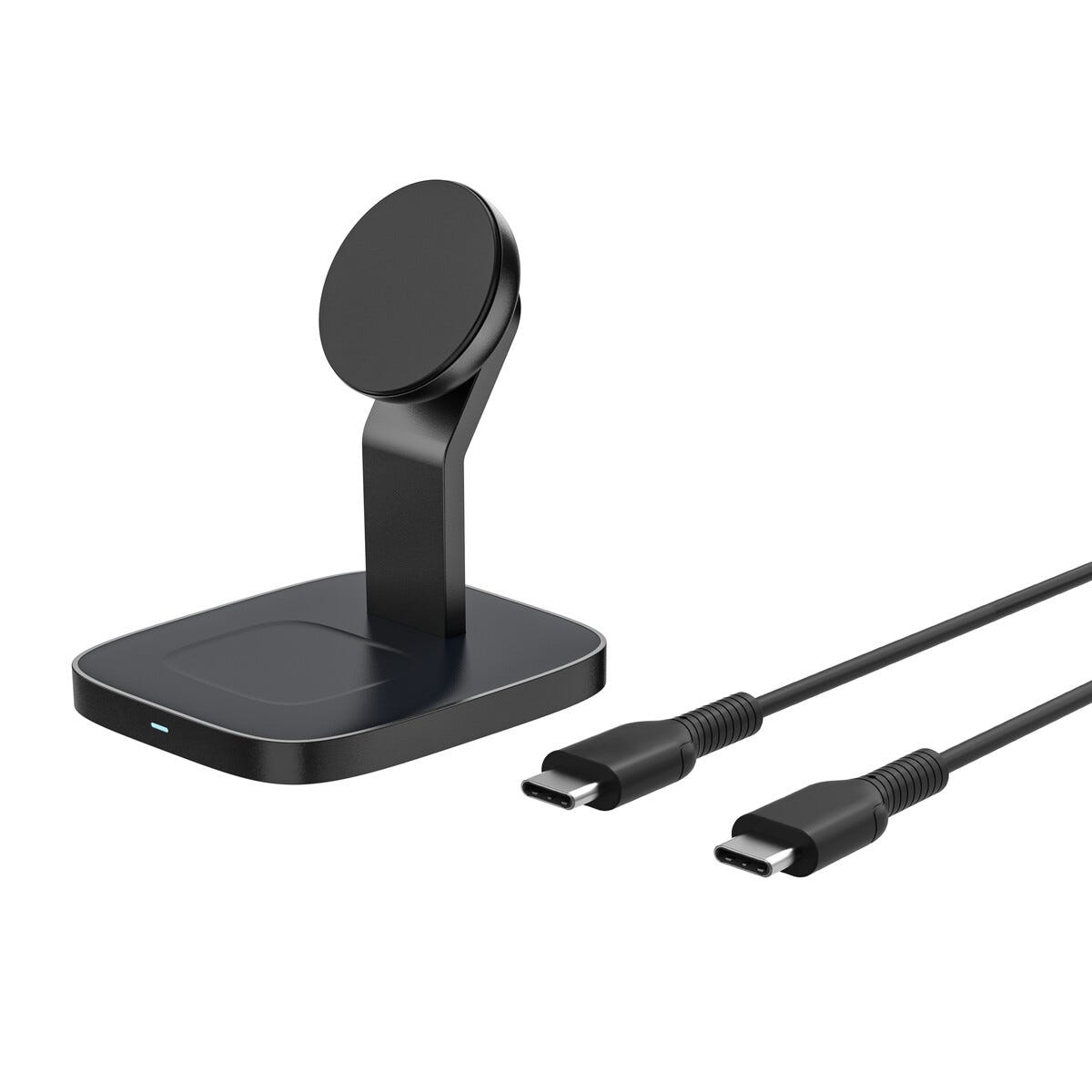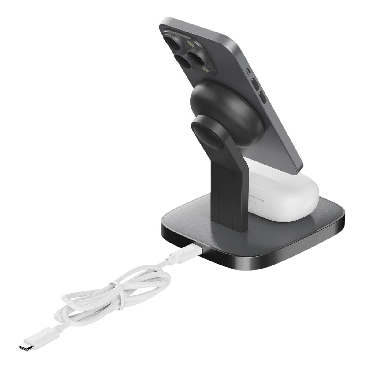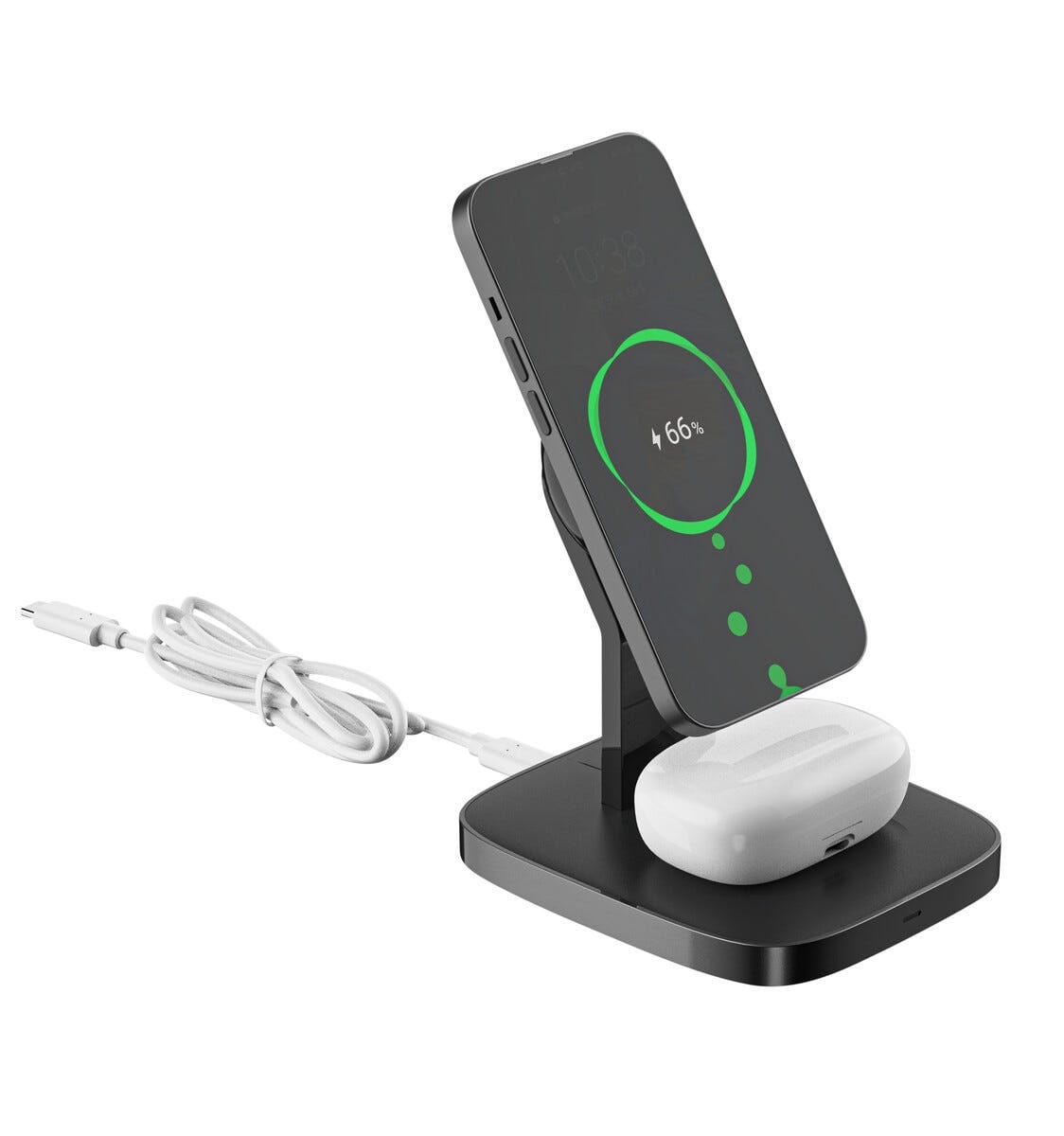 Trådløs magnetisk Qi2 ladestation 2-i-1 gør det nemt at oplade mobiltelefon og høretelefoner samtidig. Med understøttelse af Qi2-teknologi og MagSafe-kompatibilitet får kompatible iPhone-modeller stabil placering og effektiv hurtigopladning med op til 15 W effekt. Den integrerede ladeplade giver praktisk opladning af AirPods eller andre trådløse TWS-høretelefoner parallelt. Det praktiske stativdesign gør det muligt at bruge telefonen i video- eller samtaletilstand under opladning. Den kompakte og stilrene form gør ladestationen velegnet til skrivebordet, natbordet eller arbejdspladsen.