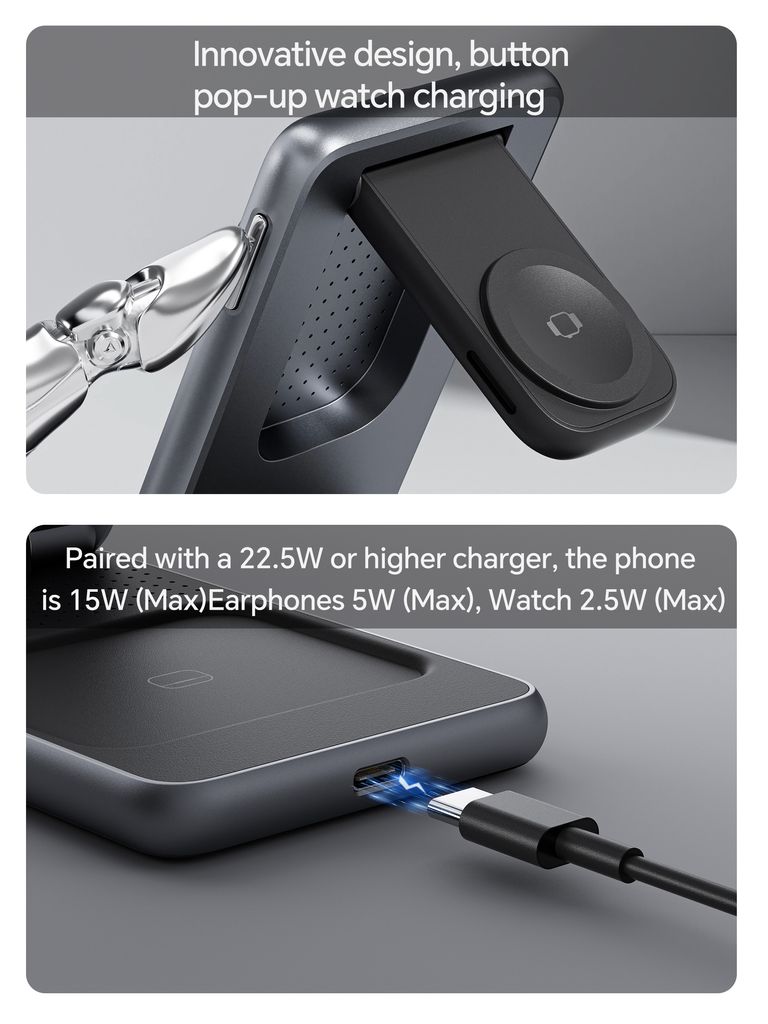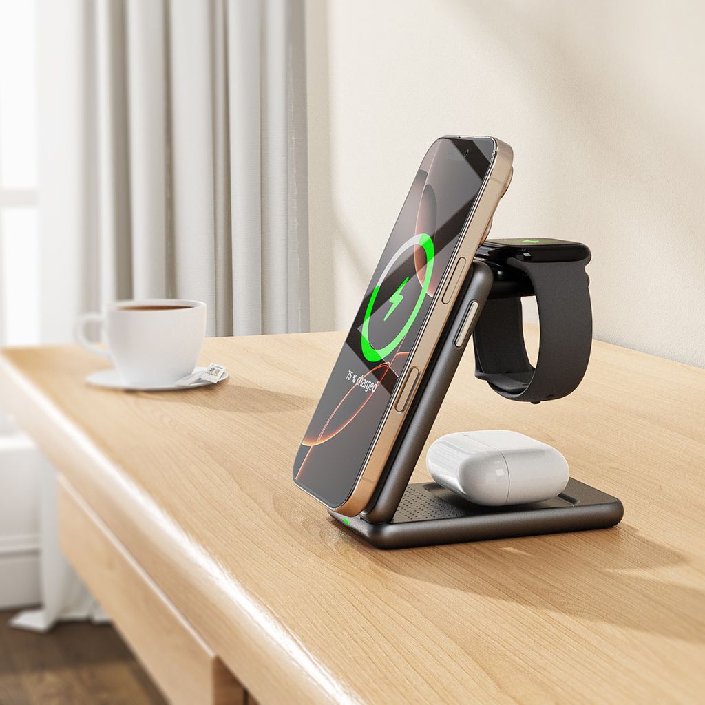 Den magnetiske ladeflade sikrer stabil placering og gør det muligt at bruge mobilen både lodret og vandret under opladning. Ladestationen understøtter trådløs hurtigopladning op til 15W for smartphones samt dedikerede ladeområder til smartwatch og høretelefoner... Læs mere