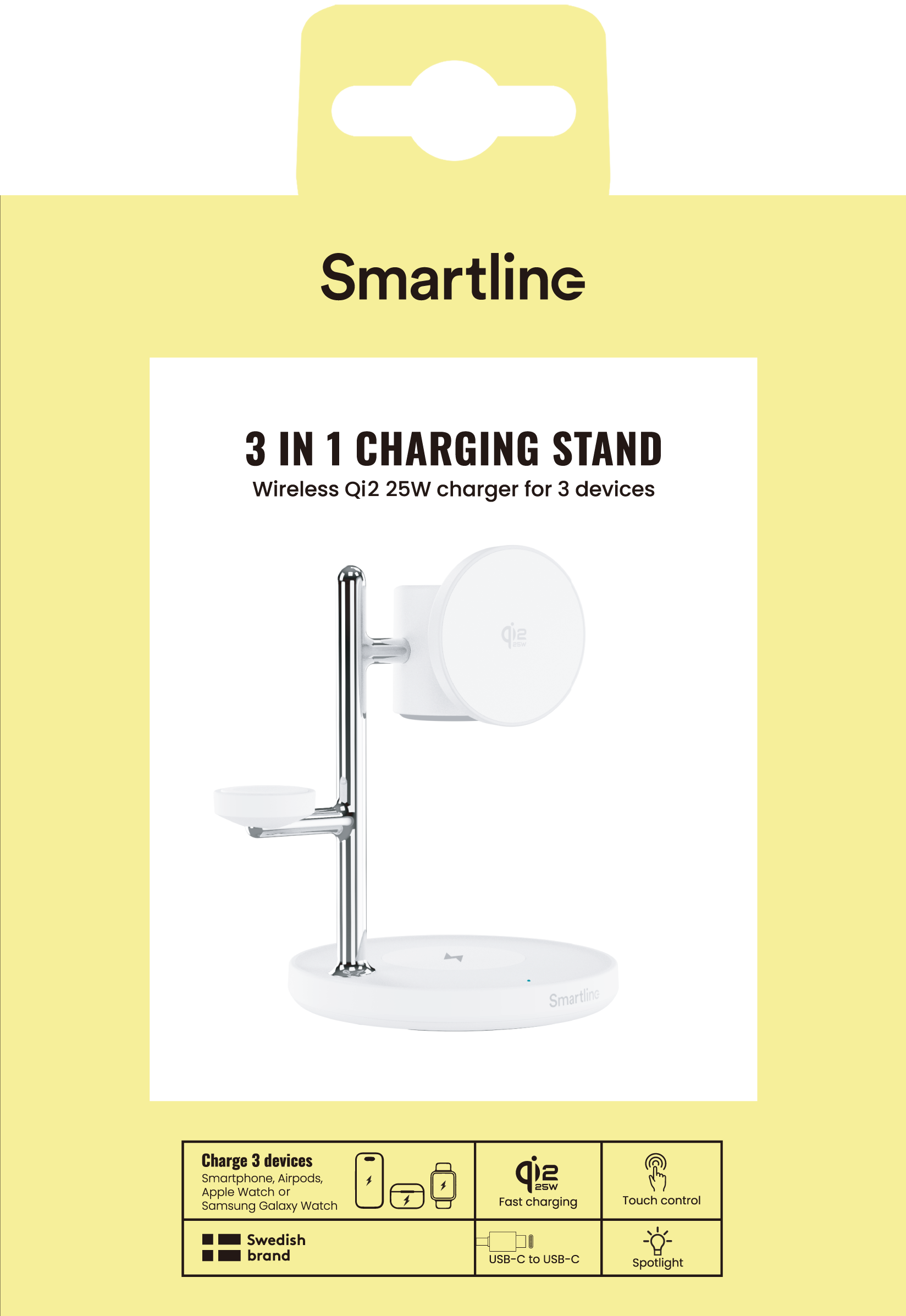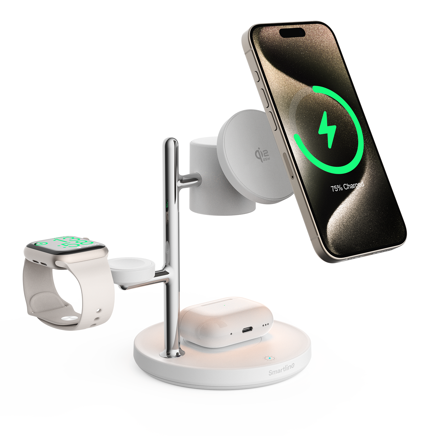 Oplad op til tre enheder samtidig med dette Qi2.2 25W MagSafe ladestativ. Oplad nemt mobiltelefon, Apple Watch og AirPods på samme sted uden unødvendigt kabelrod. Den integrerede lampe giver et blødt og praktisk lys som gør ladestationen perfekt at placere på skrivebordet eller natbordet for nem og tilgængelig brug i hverdagen.