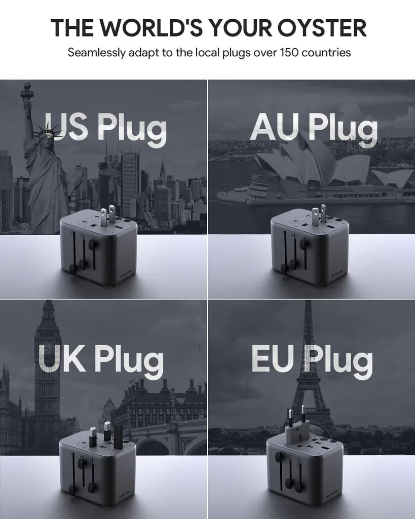 Rejseadapteren har to USB-A-porte og to USB-C-porte, så du kan oplade op til fire enheder samtidigt. USB-C-porten understøtter Power Delivery op til 20W for hurtig opladning af smartphones, tablets og andre enheder. Indbyggede sikkerhedsfunktioner beskytter mod overspænding og overophedning.