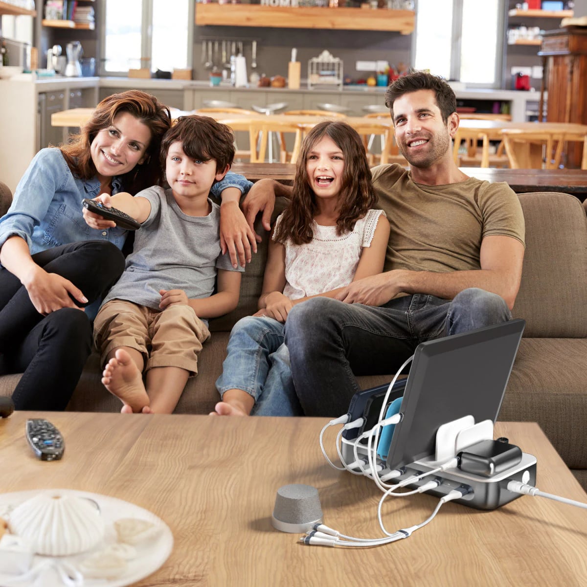 Med denne kraftige USB-ladestation kan du oplade op til ni enheder samtidigt på en nem og overskuelig måde. Ladestationen er udstyret med fem USB-C-porte og én USB-A-port og leveres med flere kabler, hvilket gør den til en komplet løsning til smartphones, tablets, høretelefoner, smartwatches og andre USB-enheder. En samlet udgangseffekt på op til 100 W sikrer hurtig og effektiv opladning, selv når mange enheder er tilsluttet.