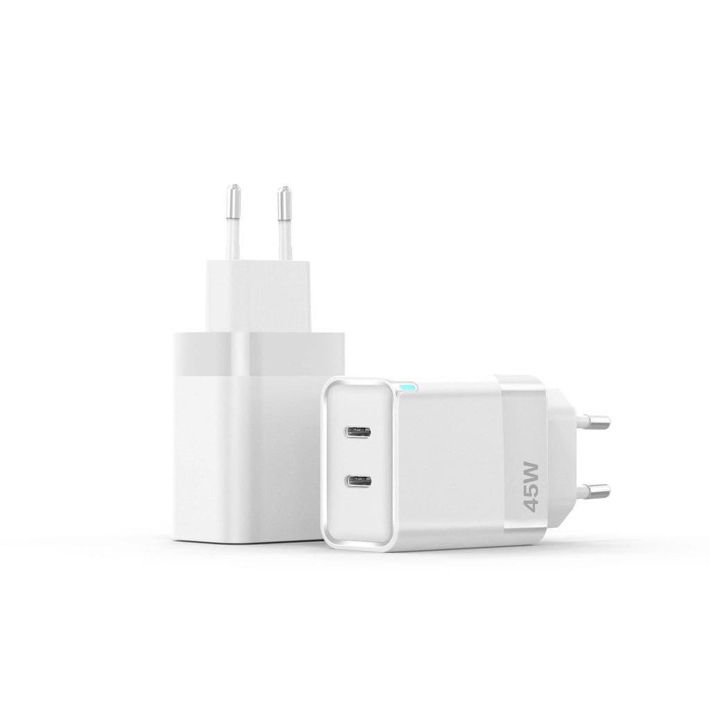 61845Dual USB-C PD GaN Hurtiglader 45W Hvidhttps://www.phonelife.dk/opladere-kabler/vaegladere/vaegladere-usb-c/dual-usb-c-pd-gan-hurtiglader-45w-hvid?channelCountry=DKhttps://www.phonelife.dk/pub_images/original/0_-_-_5_-_-_1x_uGN_5K__rBloPjysP1ysR.jpgInStock149DKK/opladere-kabler/vaegladere/vaegladere-usb-cSiGN<p>SiGN vægoplader 45W med dobbelte USB-C-porte er en kraftfuld og kompakt opladningsløsning til hurtig og effektiv opladning af moderne enheder. Med støtte for Power Delivery og Quick Charge 3.0 kan du oplade to enheder samtidigt uden at gå på kompromis med hastighed eller stabilitet. Opladeren passer til smartphones, tablets og andre USB-C-kompatible enheder samt bærbare computere, der understøtter opladning via USB-C. Den høje effekt gør det muligt at oplade kompatible enheder hurtigt og effektivt, samtidig med at det kompakte design gør opladeren nem at tage med i tasken eller bruge dagligt hjemme og på kontoret. Opladeren er CE-mærket og udviklet til sikker og stabil opladning.</p>