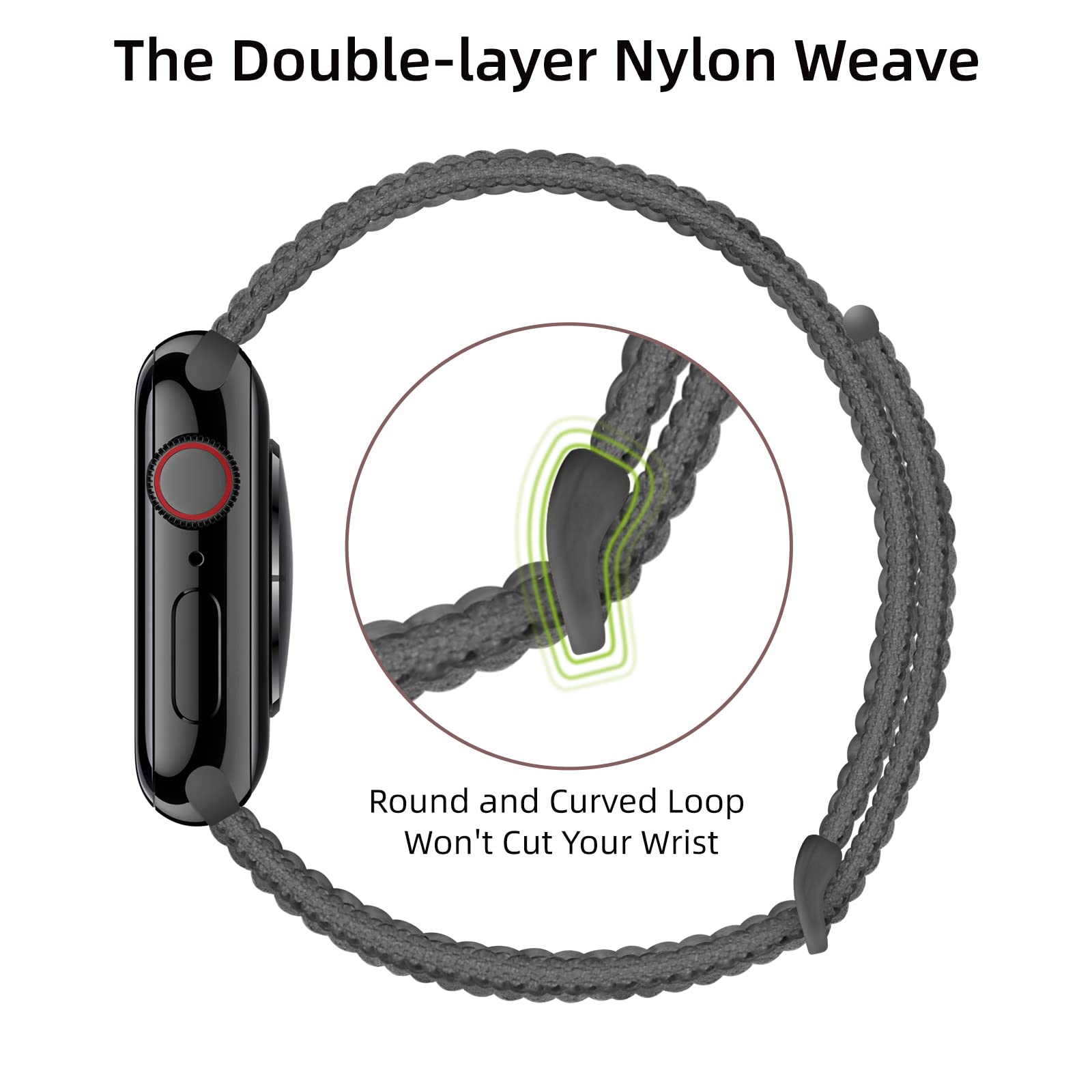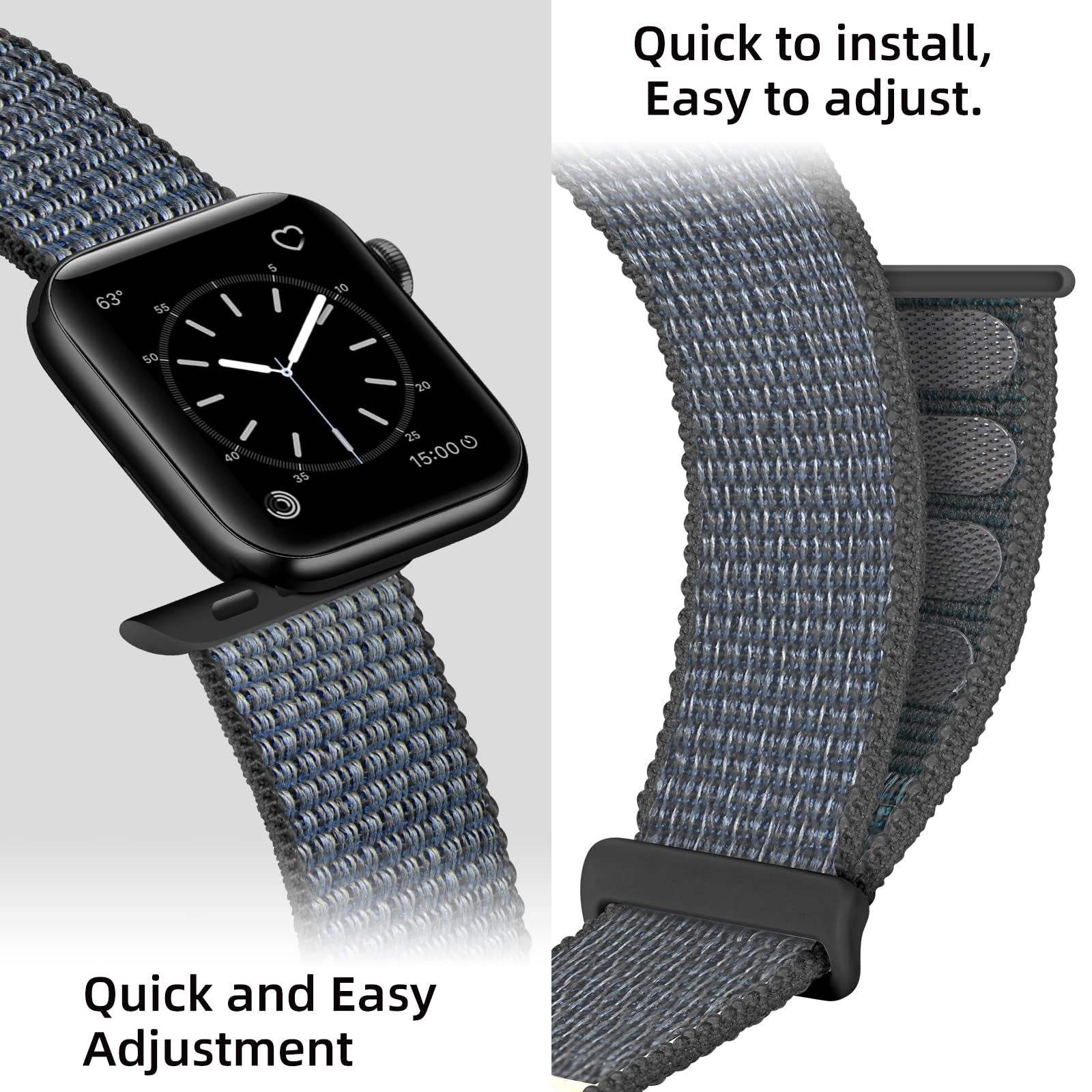 Rem i blød og behagelig nylon, der passer til Apple Watch SE 40mm. Remmen justeres nemt og lukkes med smidig velcro, hvilket gør det let at opnå en komfortabel og sikker pasform hele dagen.