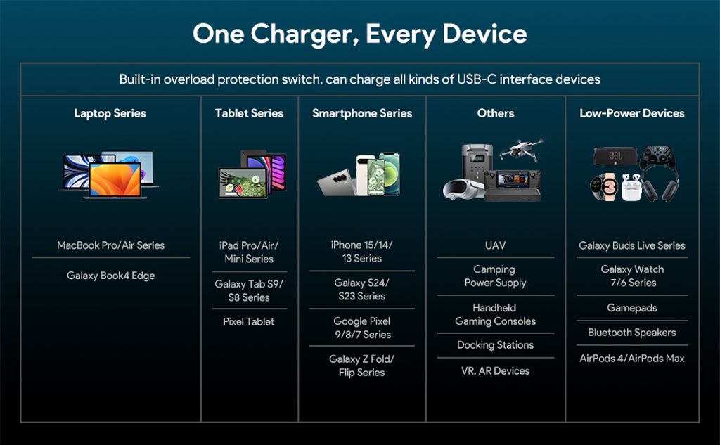 Den universelle kompatibilitet gør opladeren velegnet til MacBook, bærbare computere, tablets og smartphones med USB-C. Det lange kabel på 2 meter giver fleksibel brug derhjemme, på kontoret eller på rejser. Det kompakte design og indbyggede sikkerhedsfunktioner sikrer stabil og sikker opladning.