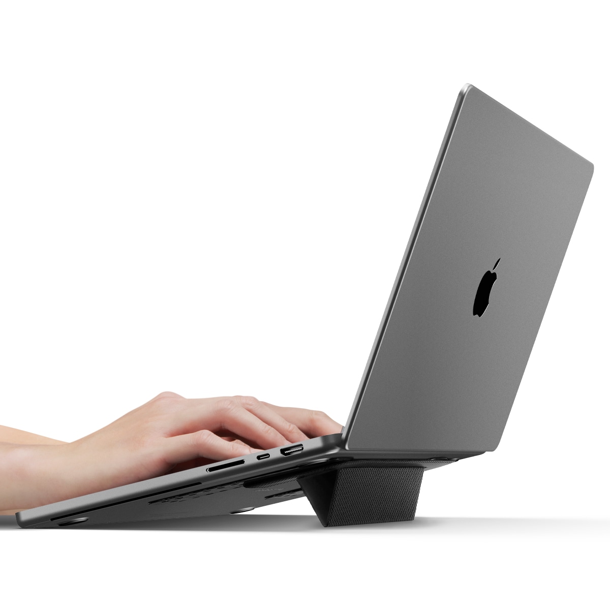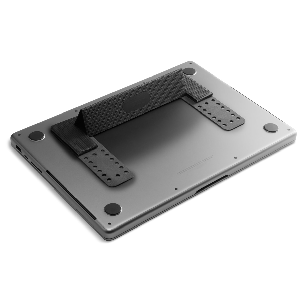 Stativet fastgøres med en stærk, genanvendelig klæbeoverflade, som sidder sikkert uden at efterlade mærker. Med to justerbare vinkler kan du forbedre din arbejdsstilling og skrivekomfort, samtidig med at luftcirkulationen under computeren øges. Den strukturerede PU-overflade sikrer, at laptopen står stabilt.